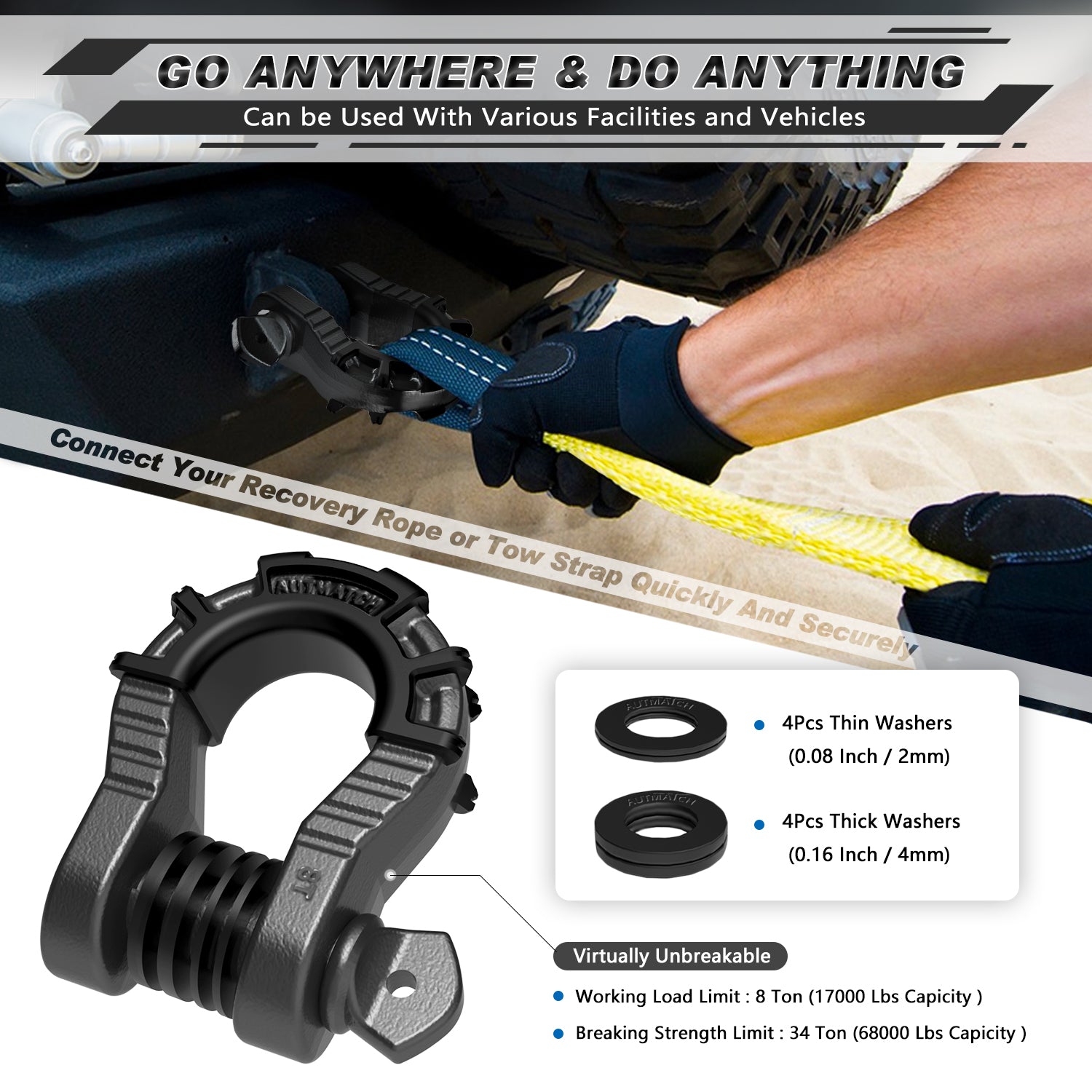 AUTMATCH Shackles 3/4" D Ring Shackle (2 Pack) 68,000Ibs Break Strength with Shackle Isolator & Washers Kit Gunmetal Gray