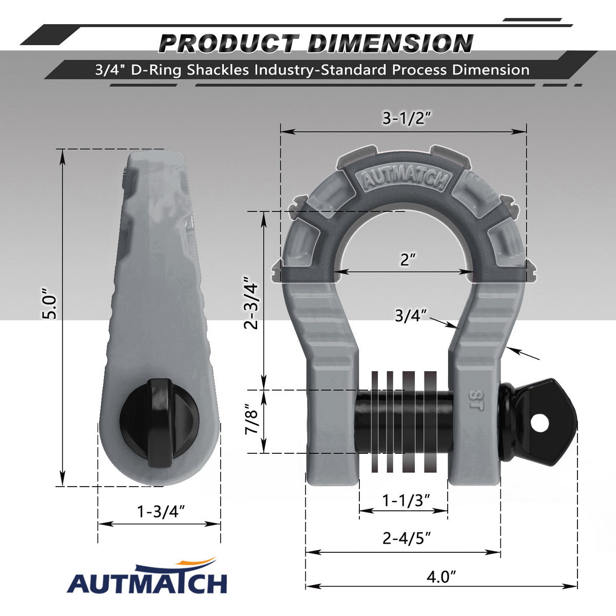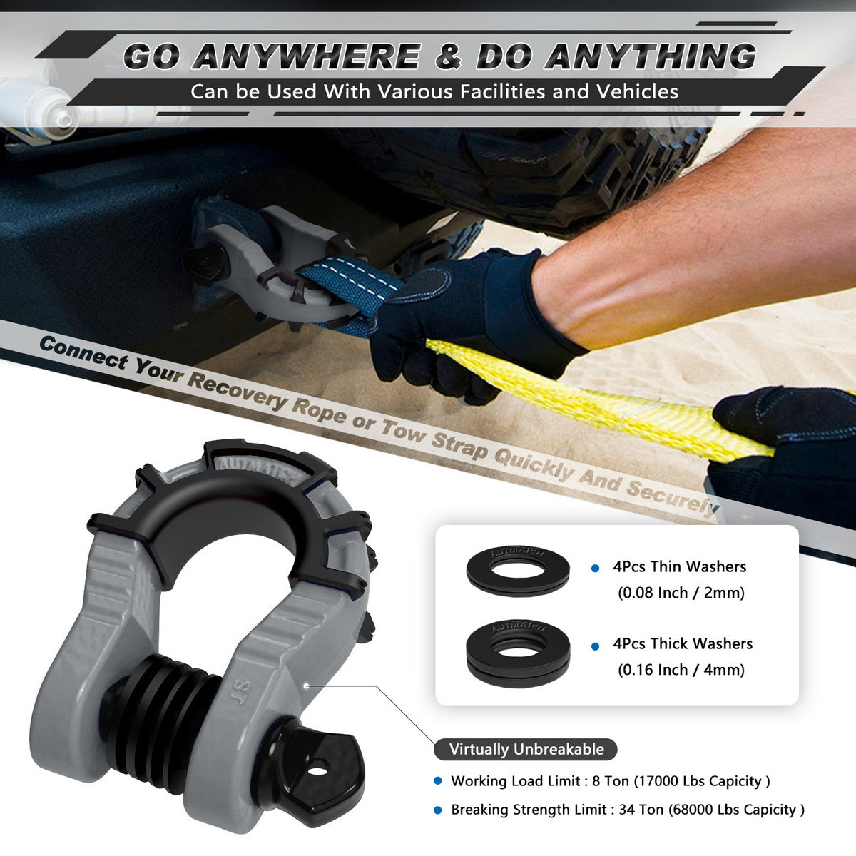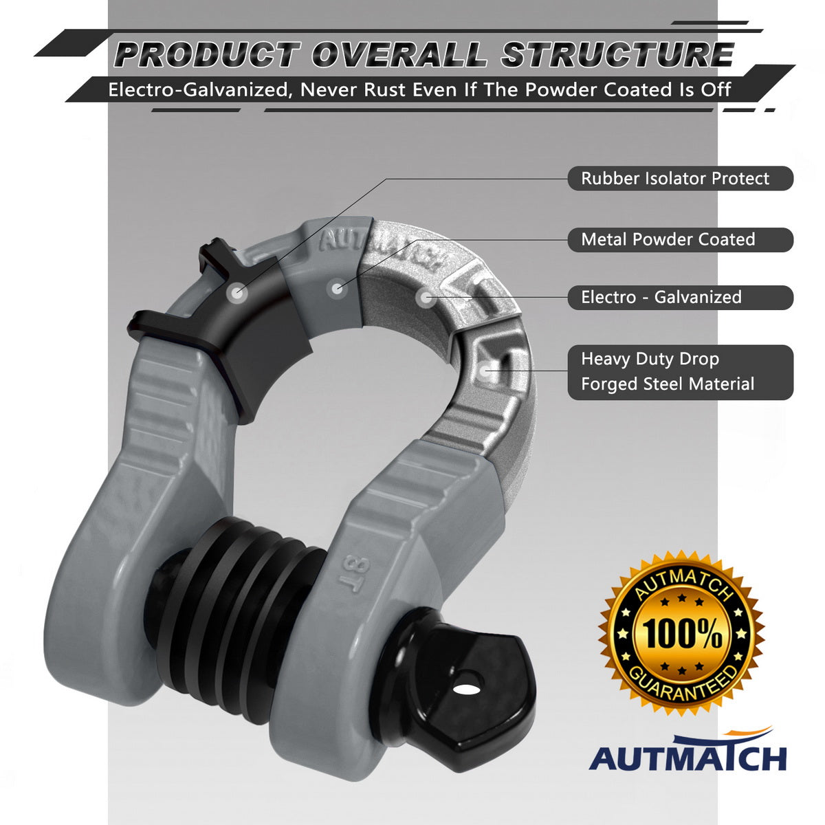 AUTMATCH Shackles 3/4" D Ring Shackle (2 Pack) 68,000Ibs Break Strength with Shackle Isolator & Washers Kit Gray & Black