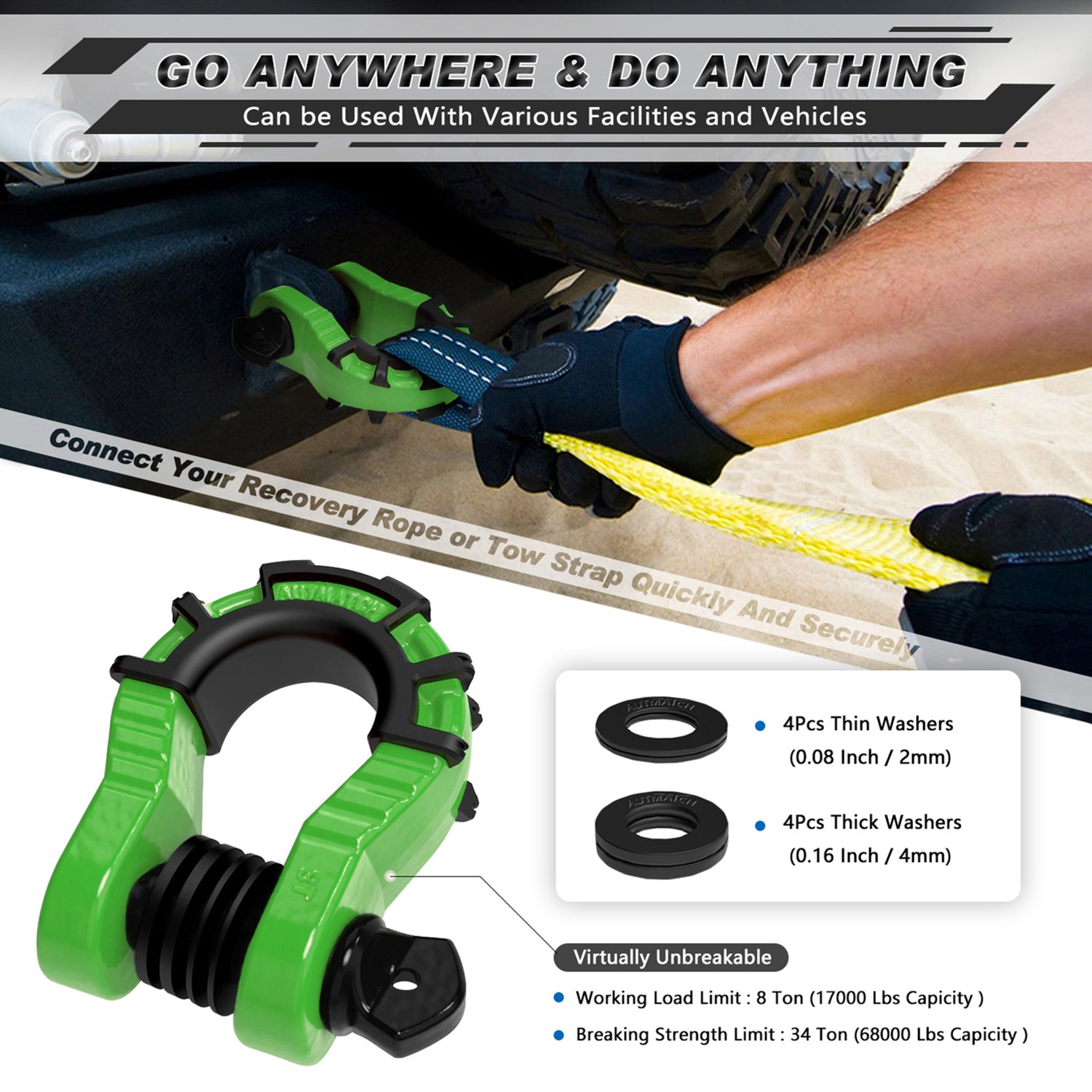 AUTMATCH Shackles 3/4" D Ring Shackle (2 Pack) 68,000Ibs Break Strength with Shackle Isolator & Washers Kit Green & Black