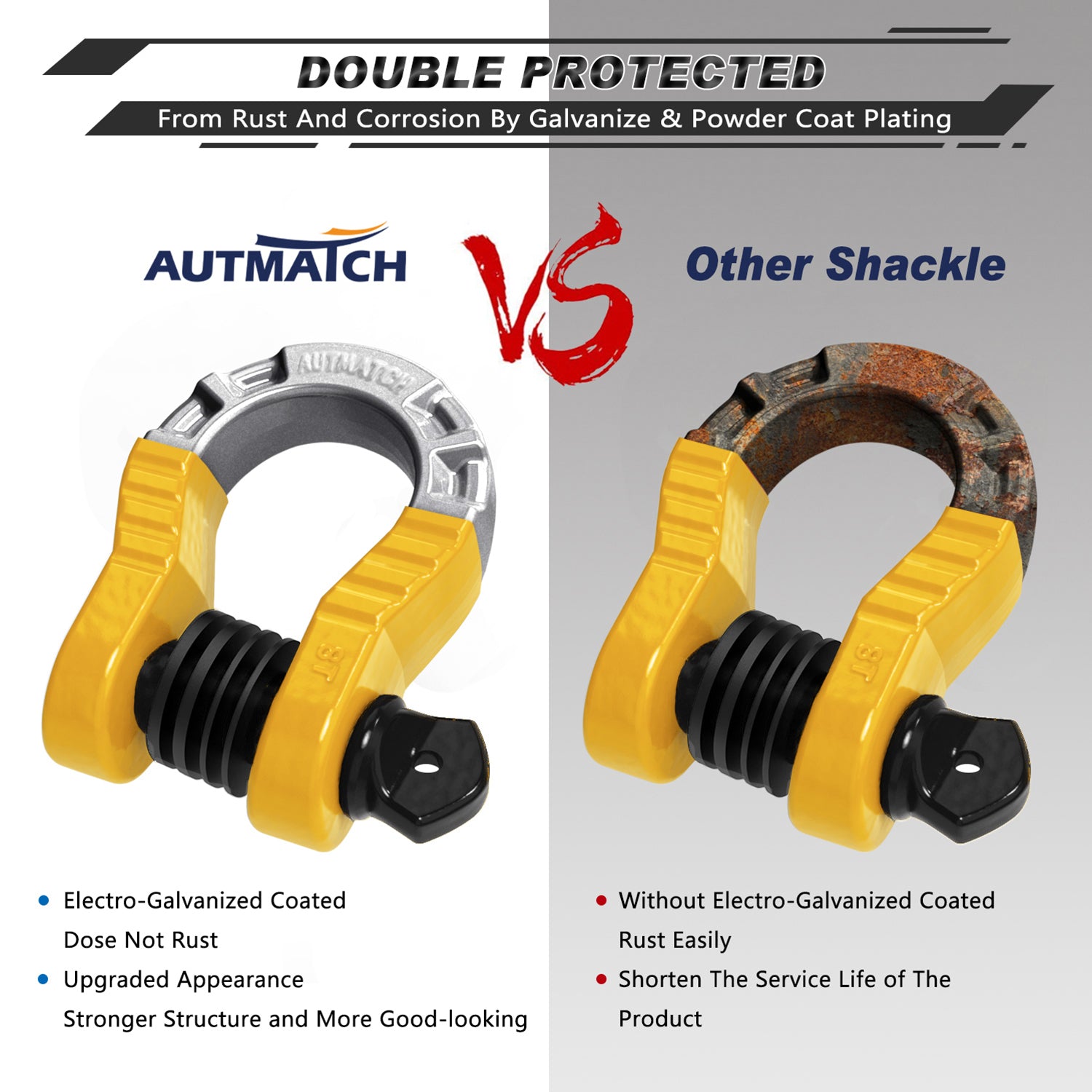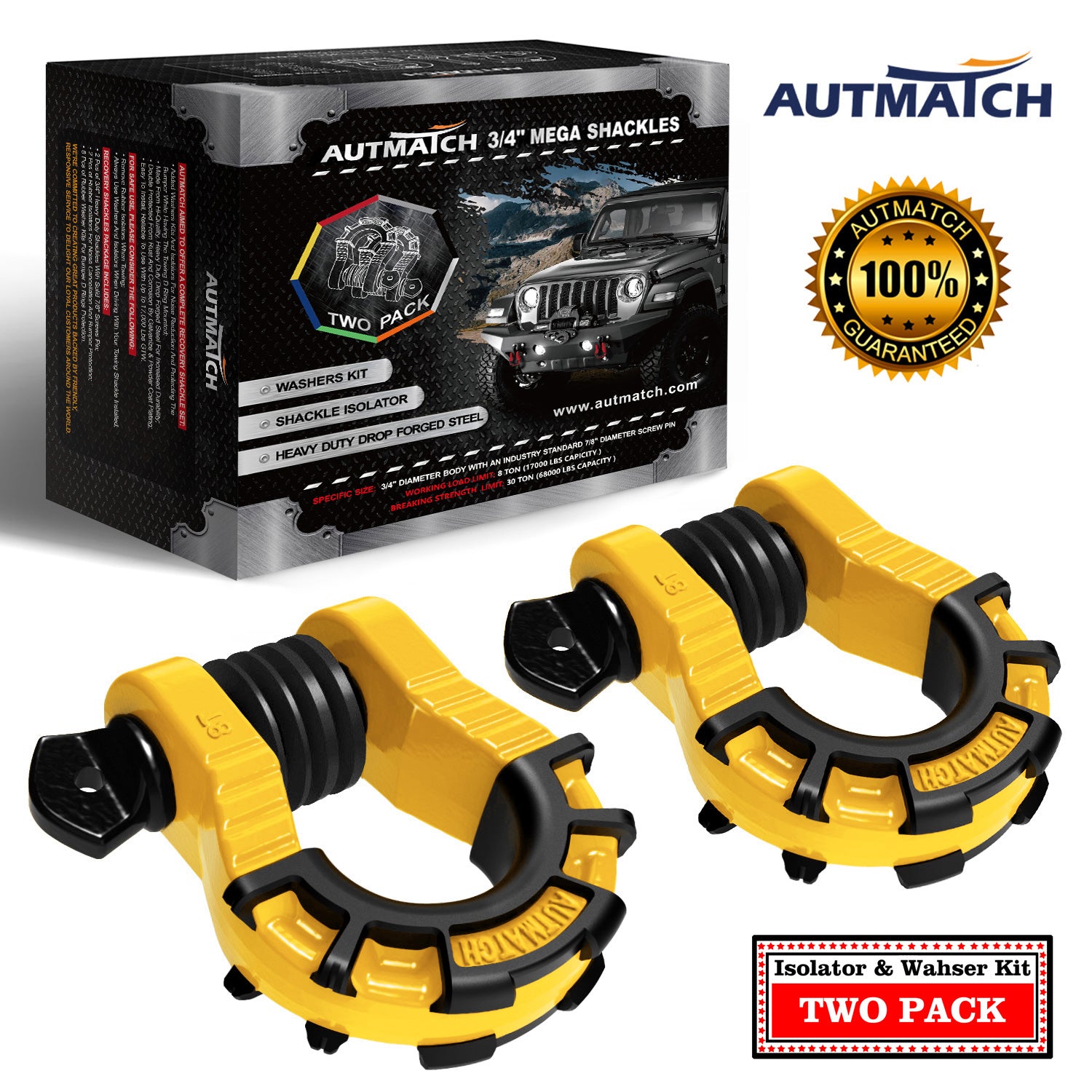 AUTMATCH Shackles 3/4" D Ring Shackle (2 Pack) 68,000Ibs Break Strength with Shackle Isolator & Washers Kit Yellow & Black