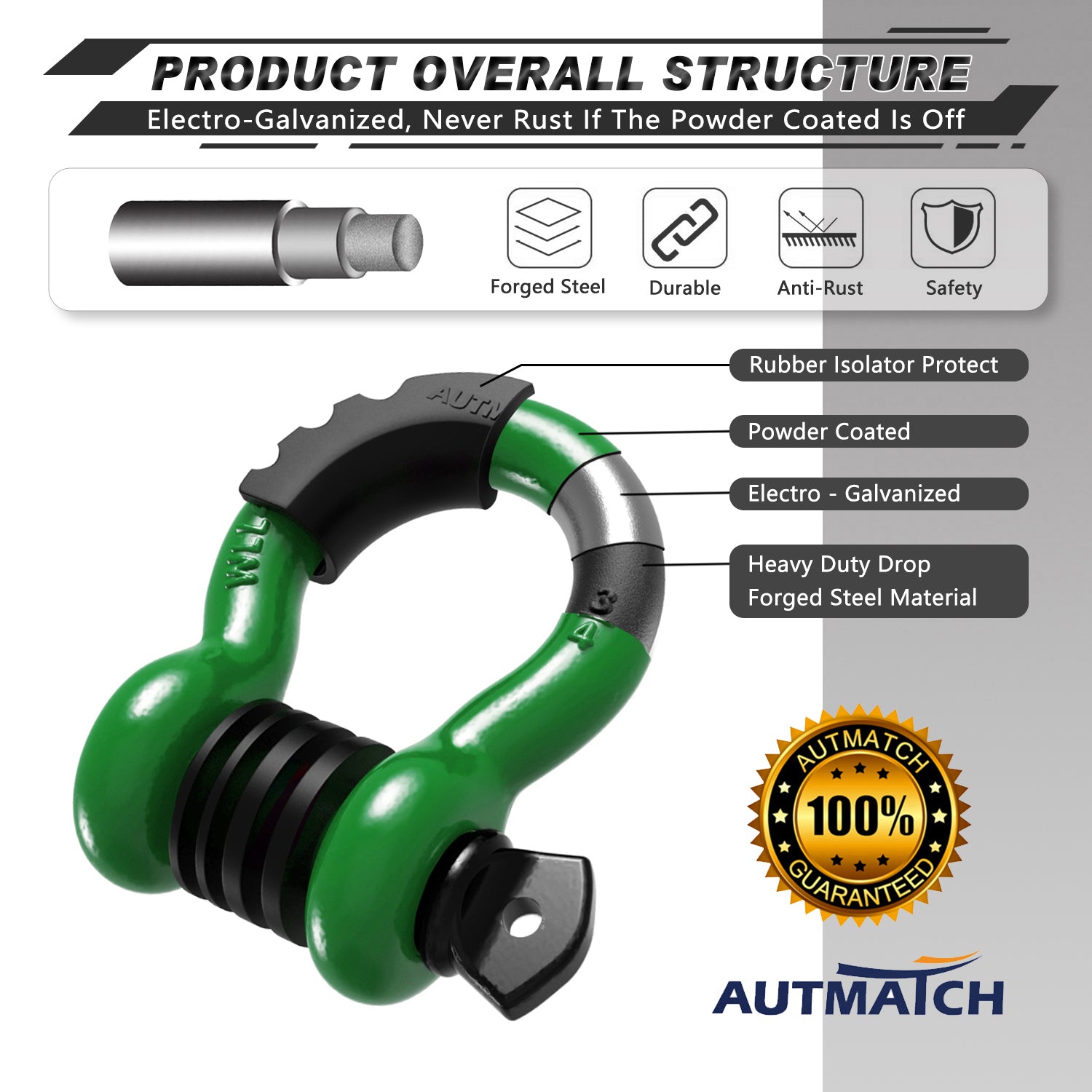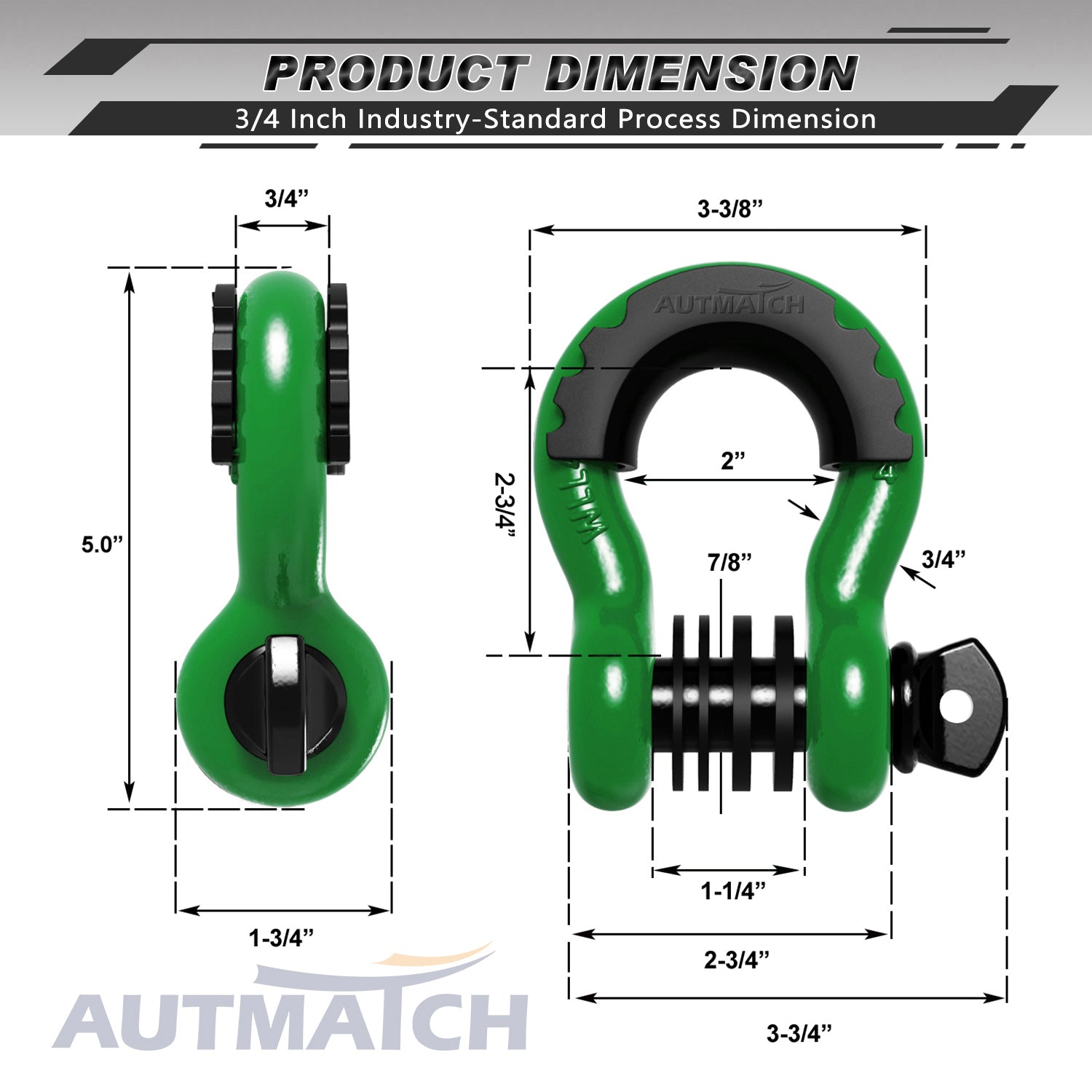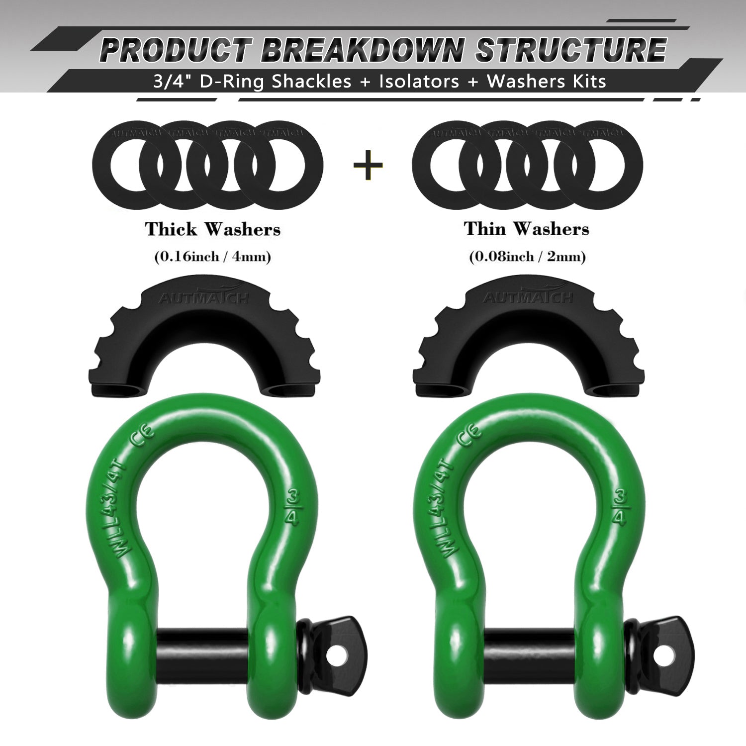 AUTMATCH 3/4" D Ring Shackle (2 Pack) 41,887Ib Break Strength with 7/8" Screw Pin and Isolator & Washer Kit Dark Green & Black