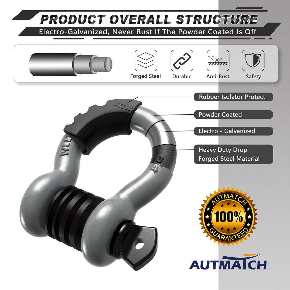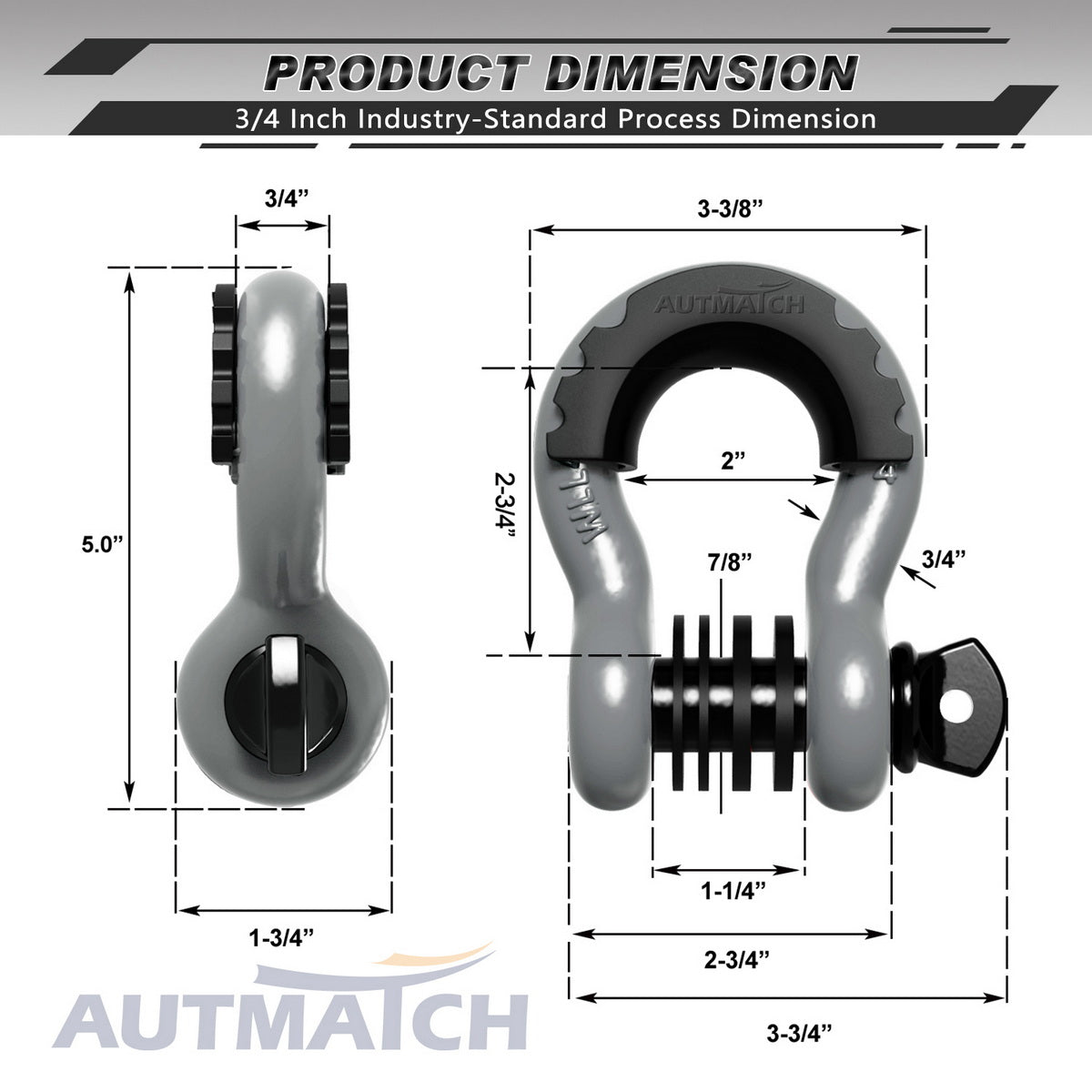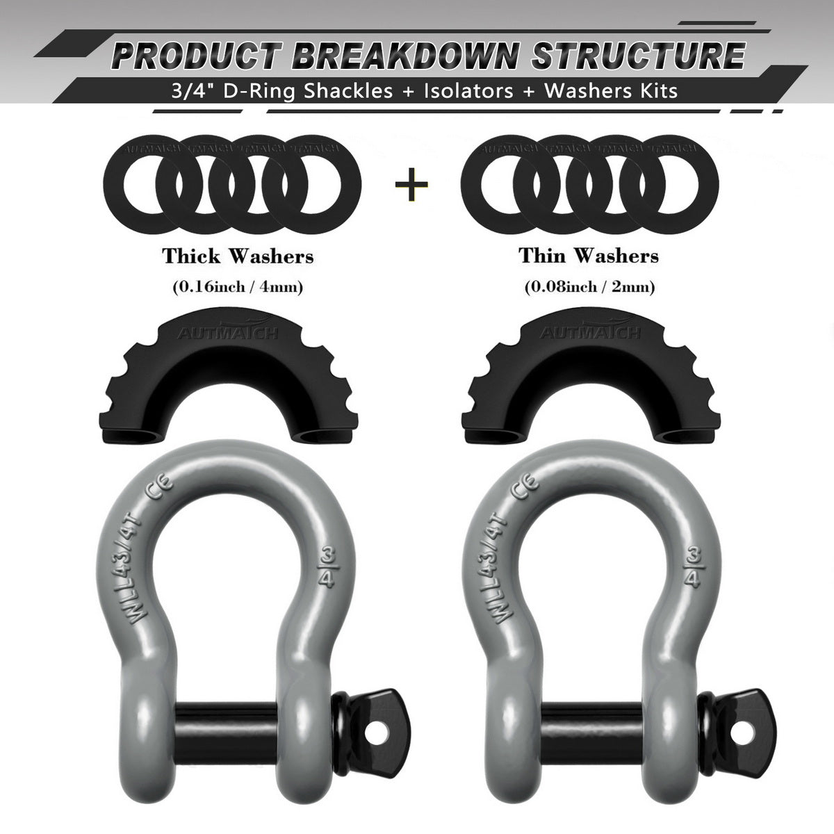 AUTMATCH 3/4" D Ring Shackle (2 Pack) 41,887Ib Break Strength with 7/8" Screw Pin and Isolator & Washer Kit Gray & Black