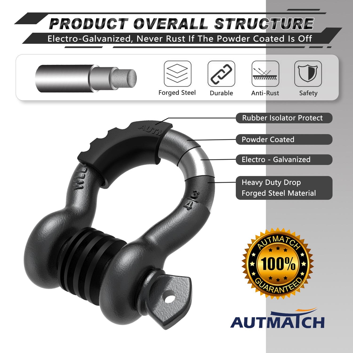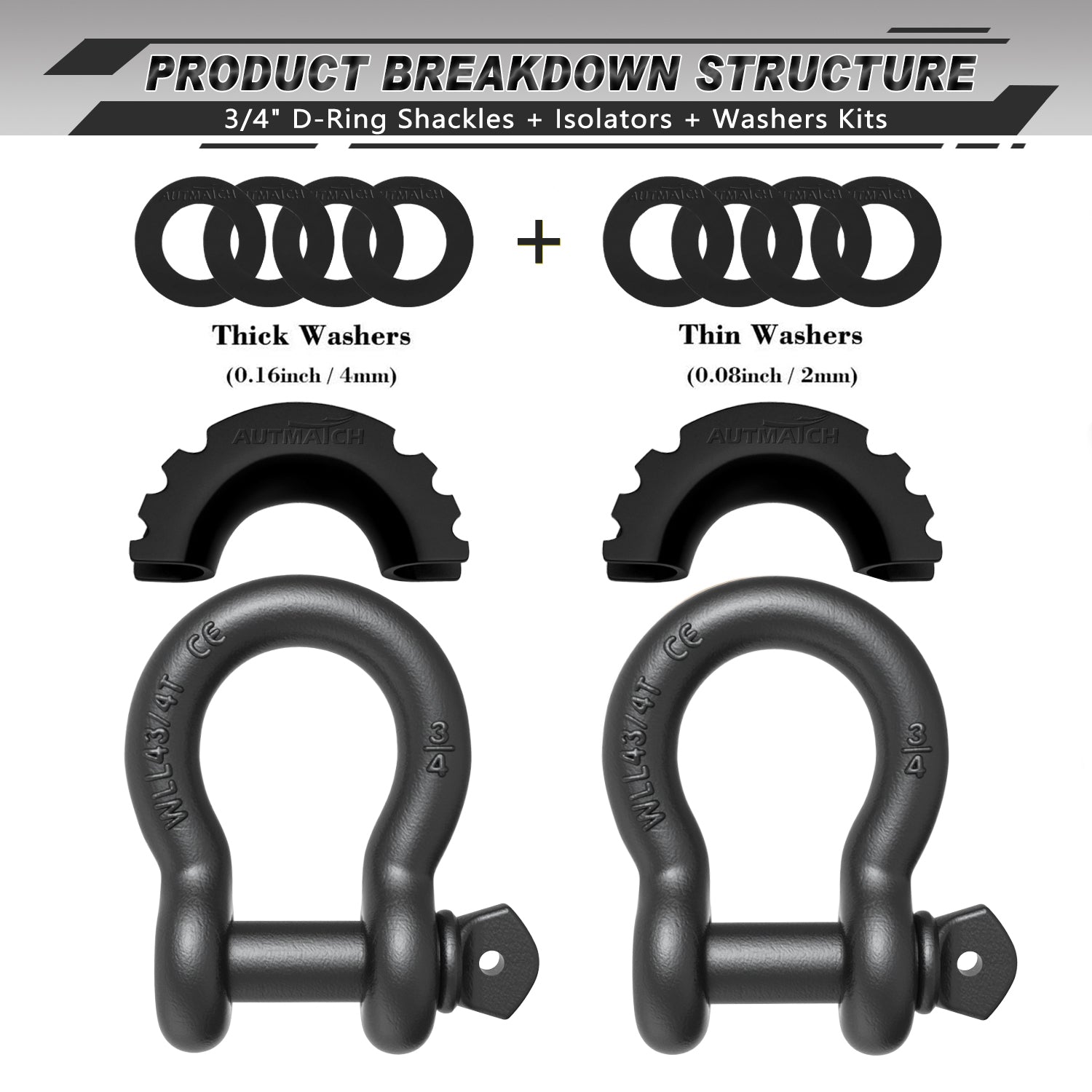 AUTMATCH 3/4" D Ring Shackle (2 Pack) 41,887Ib Break Strength with 7/8" Screw Pin and Isolator & Washer Kit Gunmetal Gray