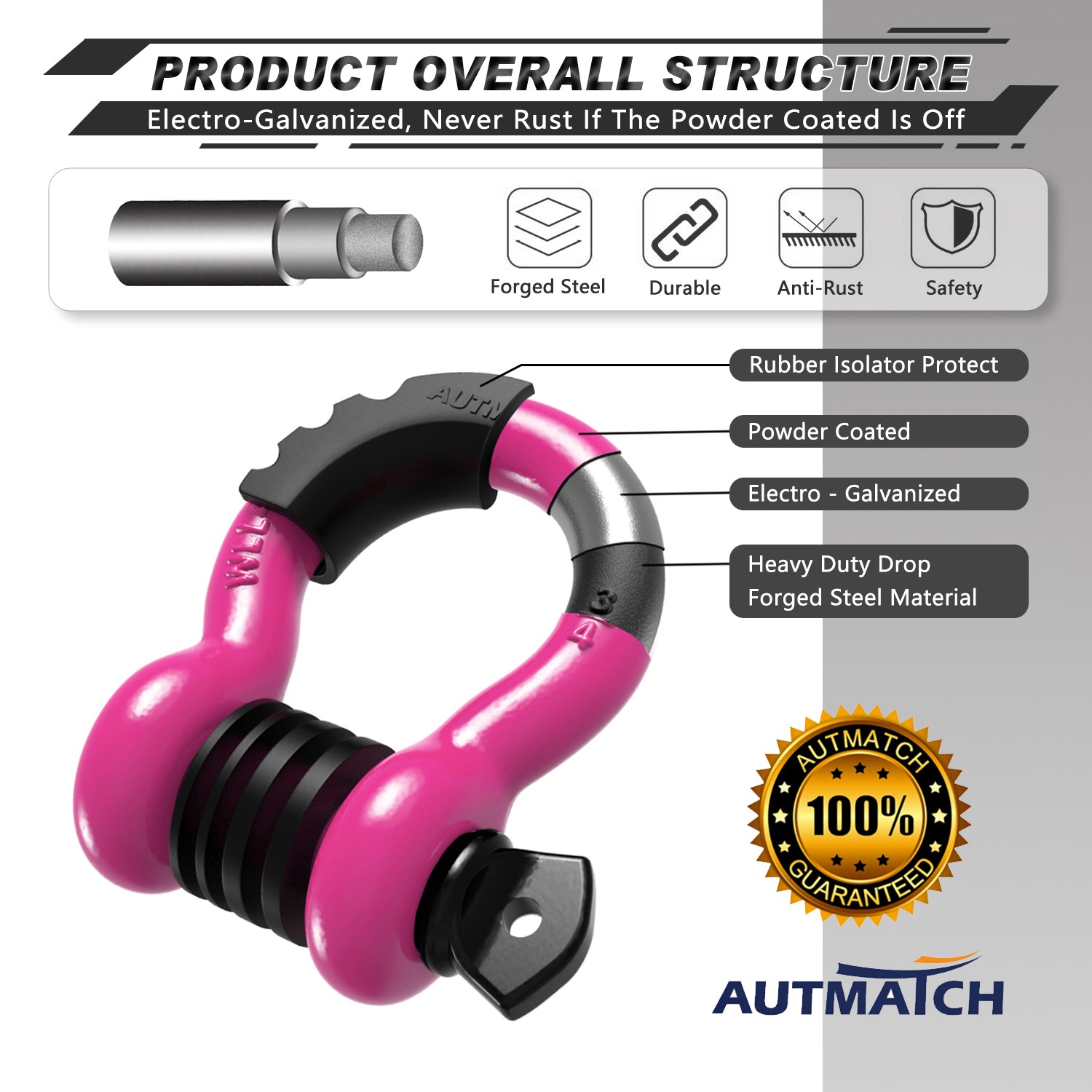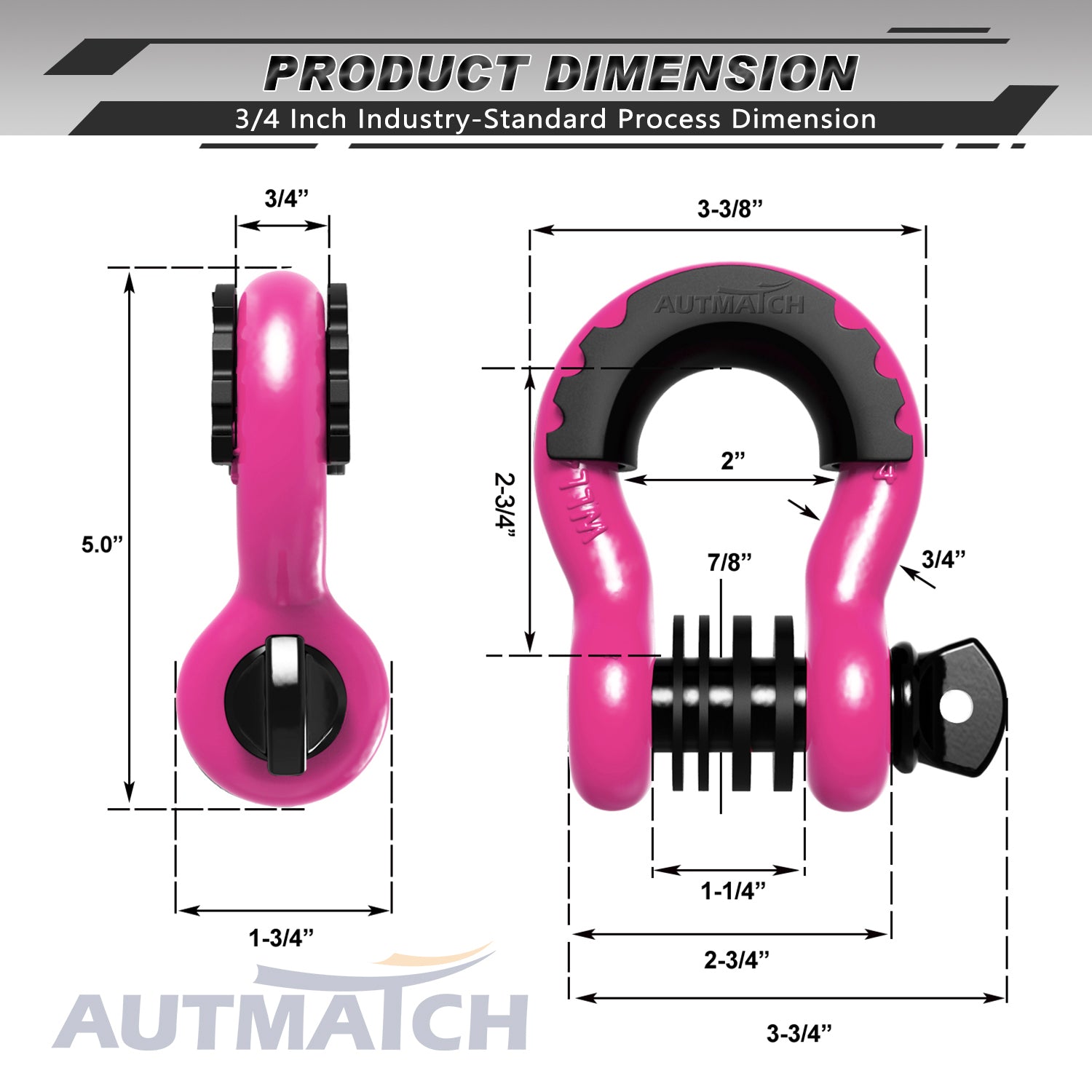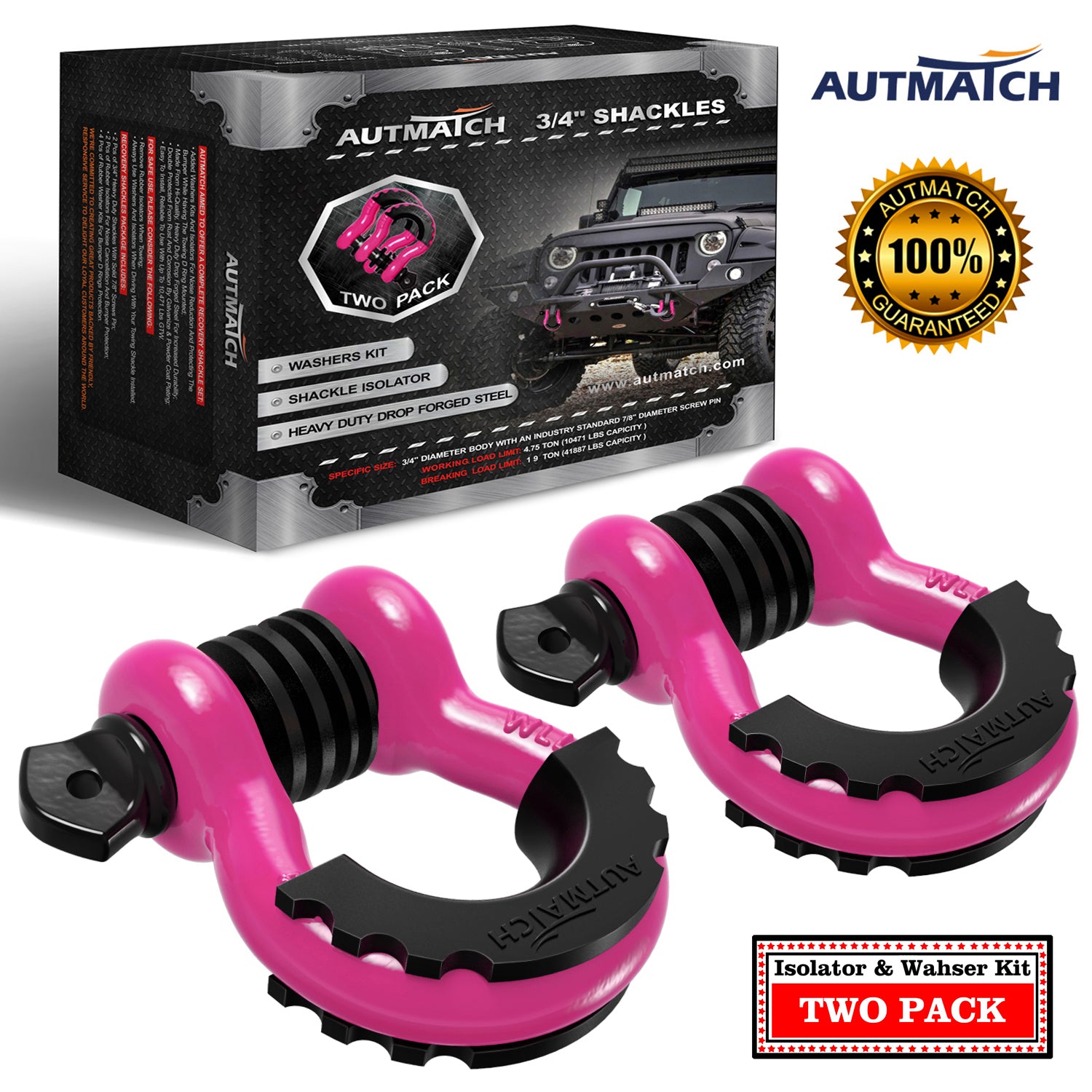 AUTMATCH 3/4" D Ring Shackle (2 Pack) 41,887Ib Break Strength with 7/8" Screw Pin and Isolator & Washer Kit Pink & Black