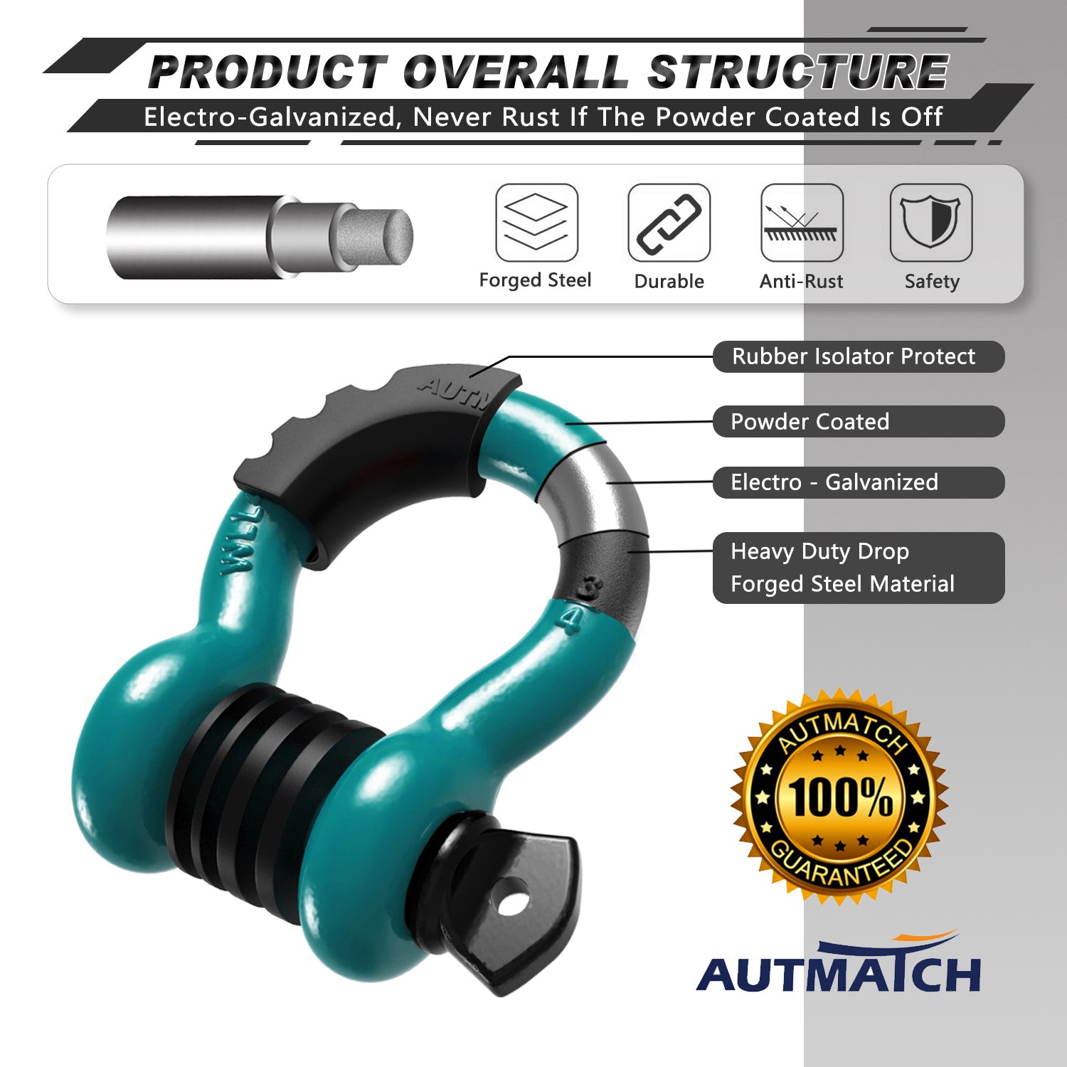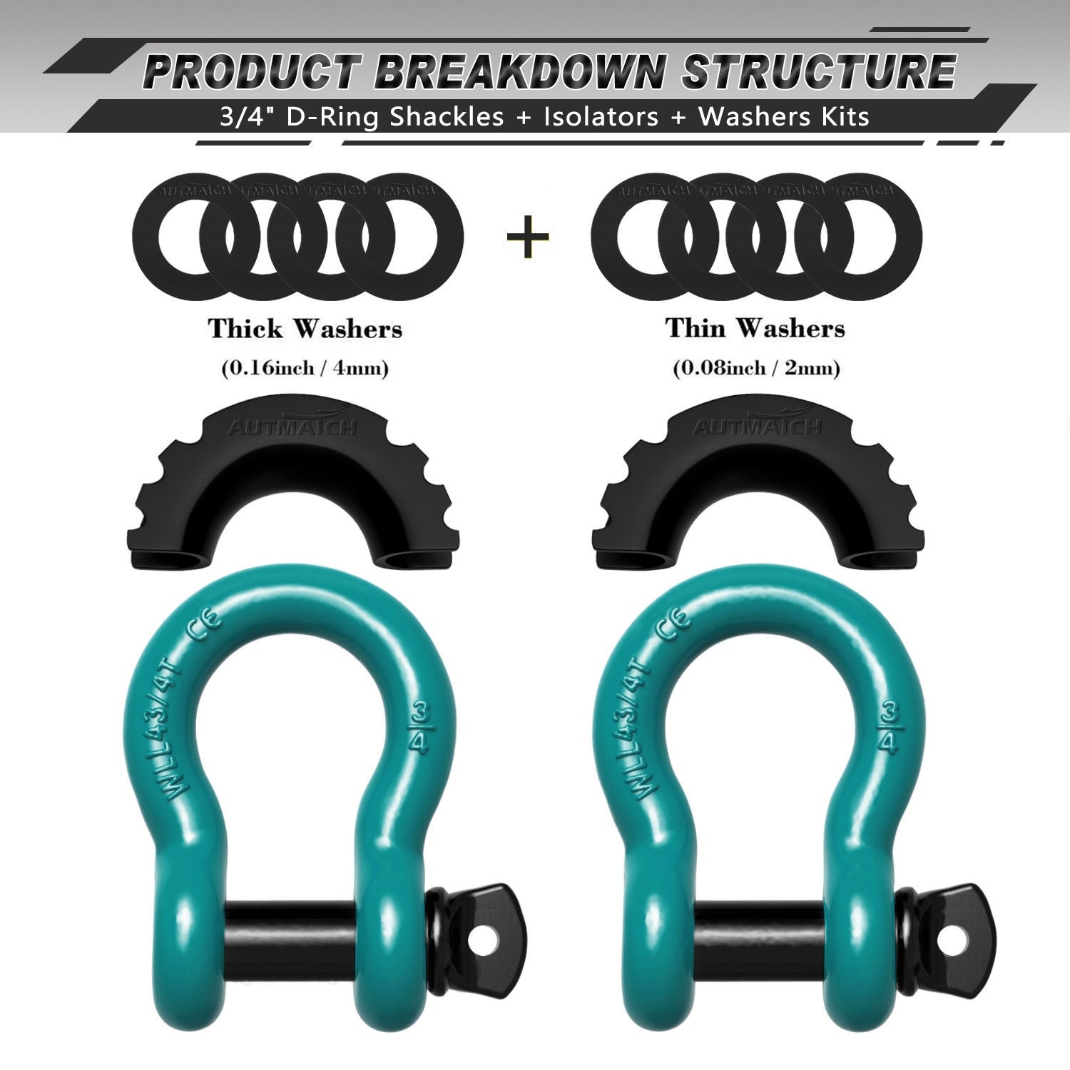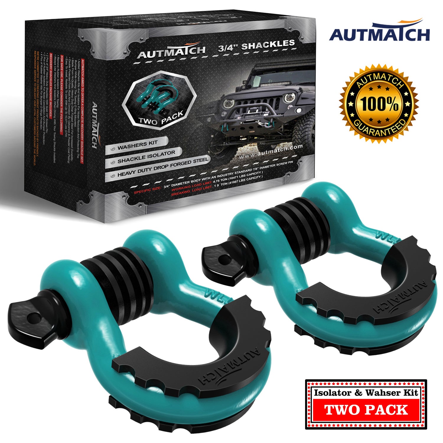 AUTMATCH 3/4" D Ring Shackle (2 Pack) 41,887Ib Break Strength with 7/8" Screw Pin and Isolator & Washer Kit Teal & Black