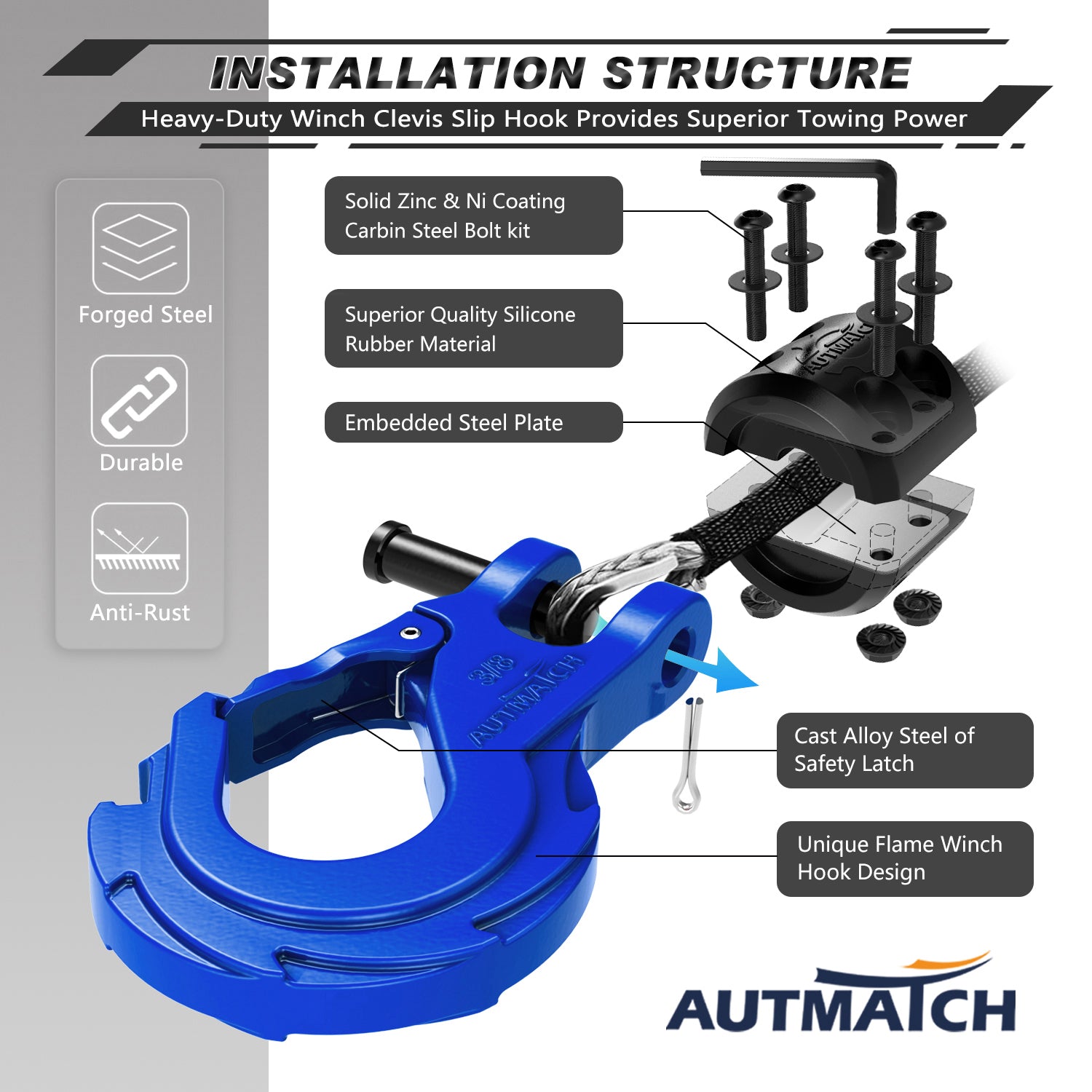 AUTMATCH Winch Hook Safety Latch 3/8" - Grade 70 Forged Steel Clevis Slip Hook and Winch Cable Hook Stopper, Max 39,600Lbs, Blue