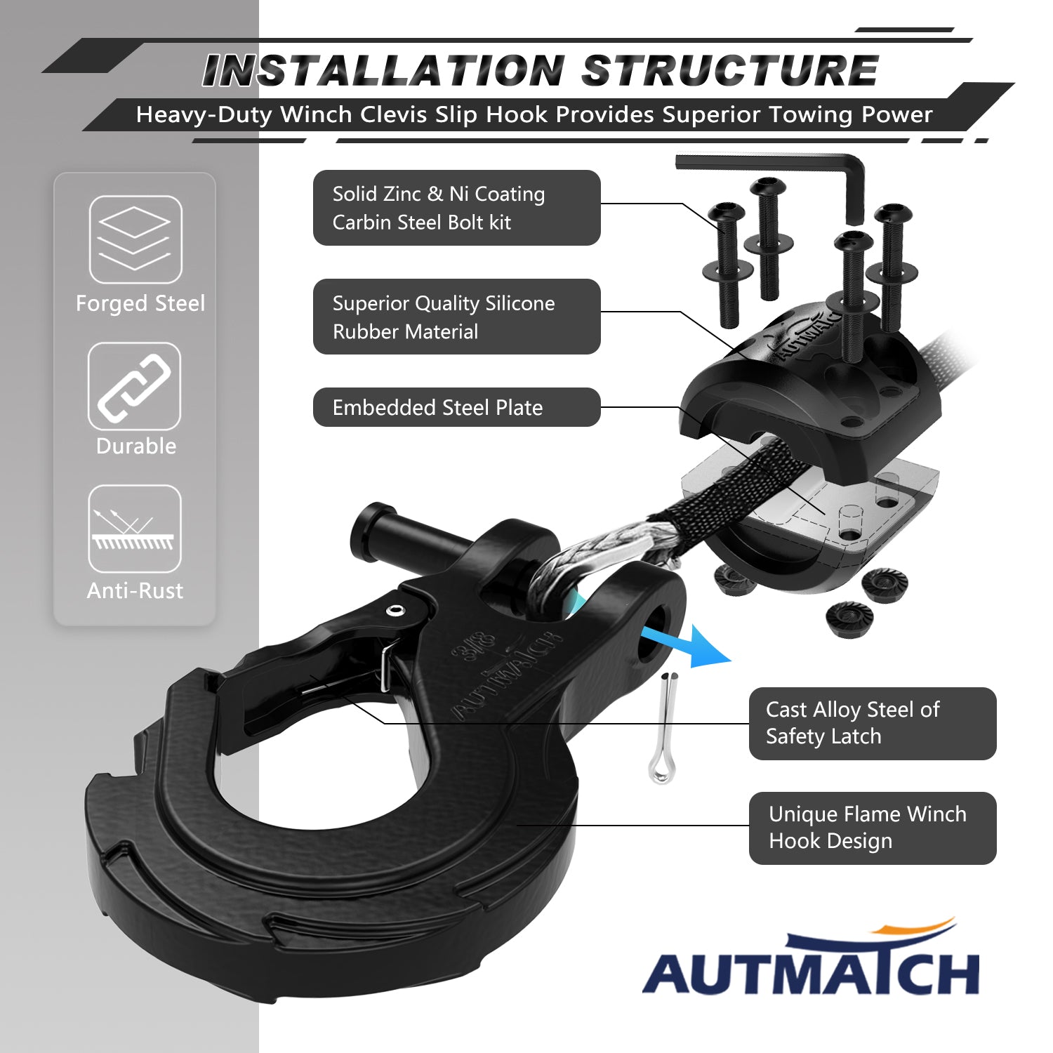 AUTMATCH Winch Hook Safety Latch 3/8" - Grade 70 Forged Steel Clevis Slip Hook and Winch Cable Hook Stopper, Max 39,600Lbs, Matte Black