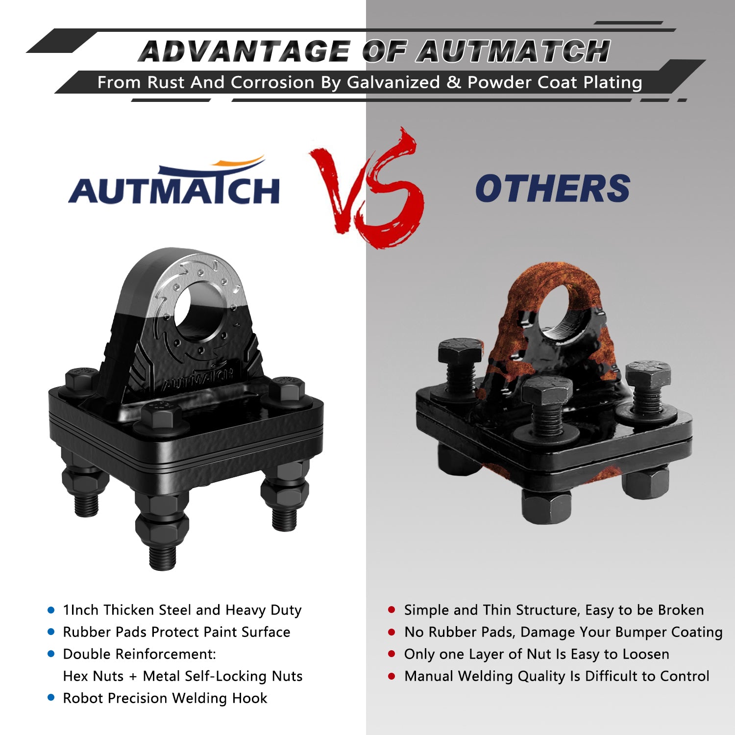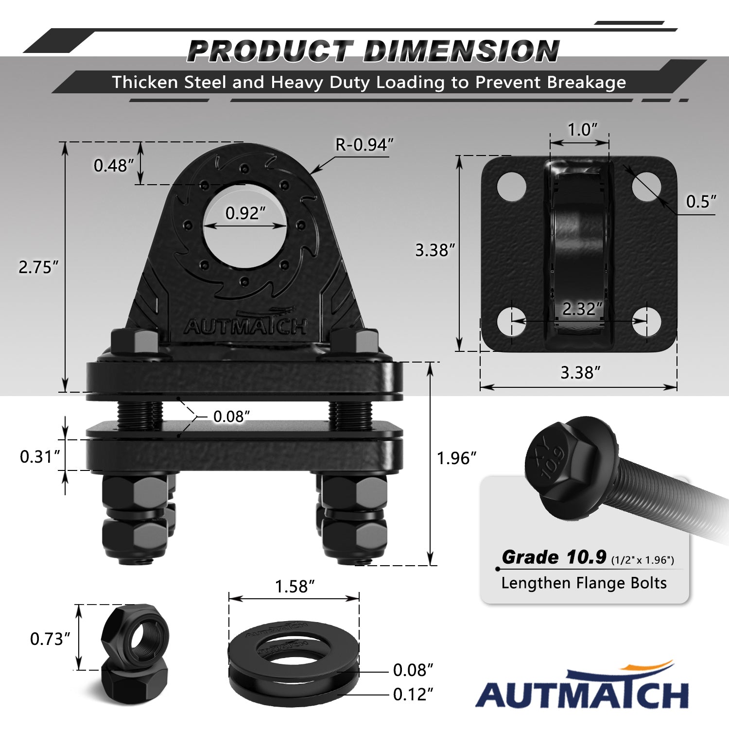 - Fitted Suite: Bolt-on Clevis Mount Bracket with Backer Plate and Rubber Pad, Grade 10.9 Flange Bolts + Flat Washers + Hex Nuts + Spring Lock Washers + Metal Self-Locking Nuts, All the Hardware of Surface was Covered By Electro-Plating Black Protect