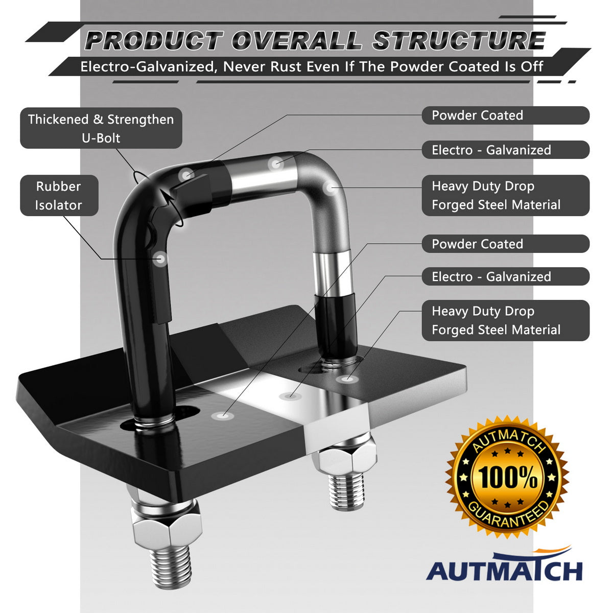 - Fitted Suite: Heavy Duty Anti-Rust U-Bolt and Tightener Plate, 2 Spring Lock Washers, 2 Flat Washers, 4 Locking Nuts, All the Parts of Surface was Covered By Galvanize & Powder Coated.