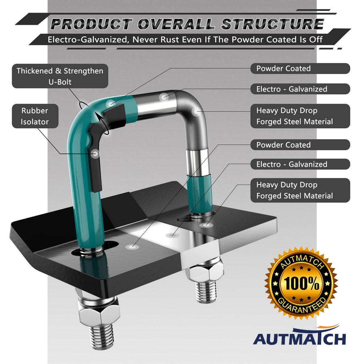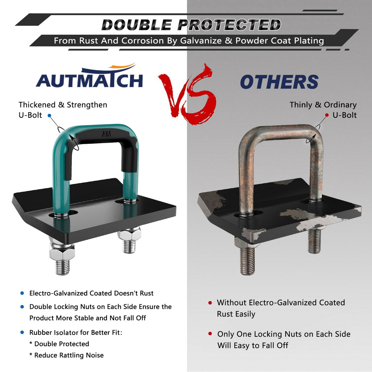 - Fitted Suite: Heavy Duty Anti-Rust U-Bolt and Tightener Plate, 2 Spring Lock Washers, 2 Flat Washers, 4 Locking Nuts, All the Parts of Surface was Covered By Galvanize & Powder Coated.