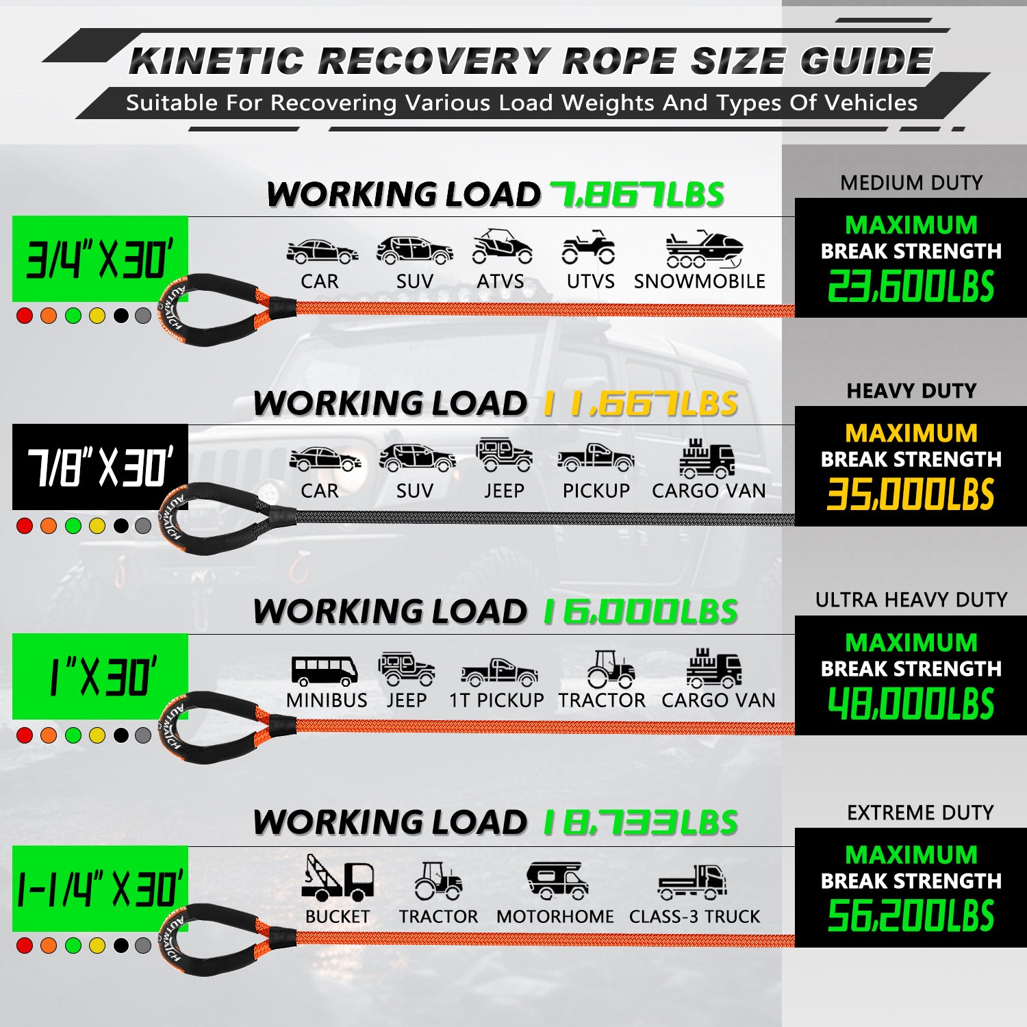 - Super Quality: The Kinetic Recovery Rope was Made of 100% Nylon N66 Double Braided Material and Coated with Mil-Spec Polymers, Which the Break Strength Up To 35000Lbs to Keep It More Safety & Stability, Capable of Recovering and Towing Off-road Vehicles, Pickups, ATV, Tractor, Truck Etc
