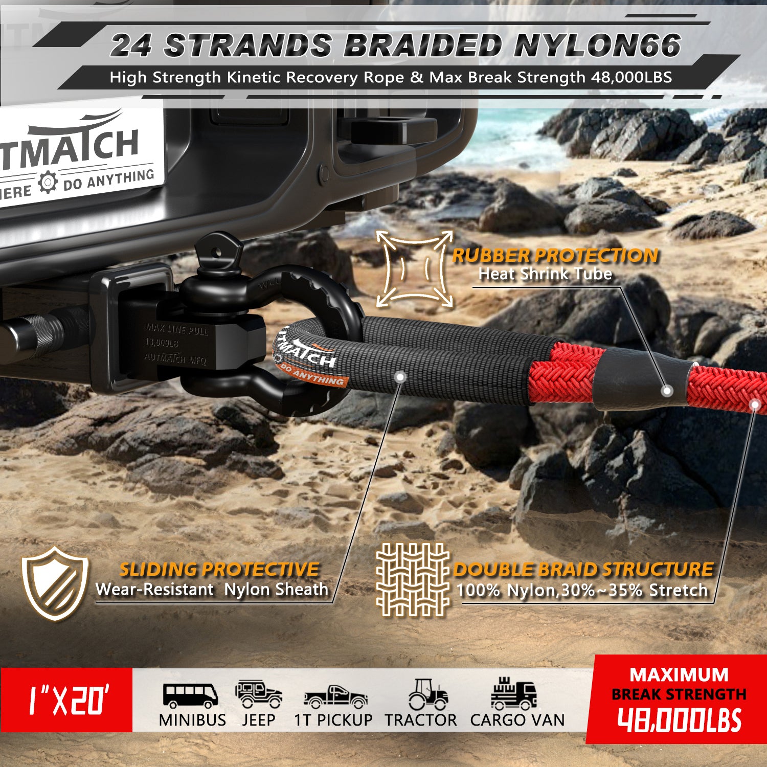 - Super Quality: The Kinetic Recovery Rope was Made of 100% Nylon N66 Double Braided Material and Coated with Mil-Spec Polymers, Which the Break Strength Up To 48000Lbs to Keep It More Safety & Stability, Capable of Recovering and Towing Off-road Vehicles, Pickups, ATV, Tractor, Truck Etc