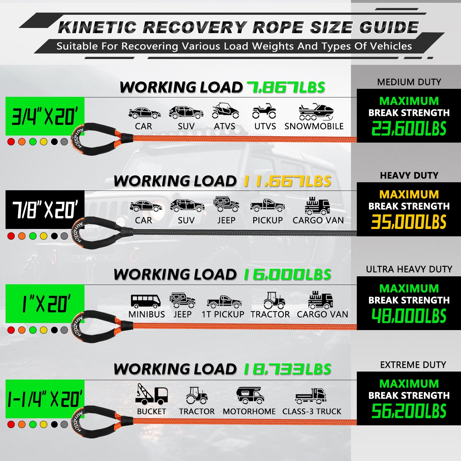 - Super Quality: The Kinetic Recovery Rope was Made of 100% Nylon N66 Double Braided Material and Coated with Mil-Spec Polymers, Which the Break Strength Up To 35000Lbs to Keep It More Safety & Stability, Capable of Recovering and Towing Off-road Vehicles, Pickups, ATV, Tractor, Truck Etc