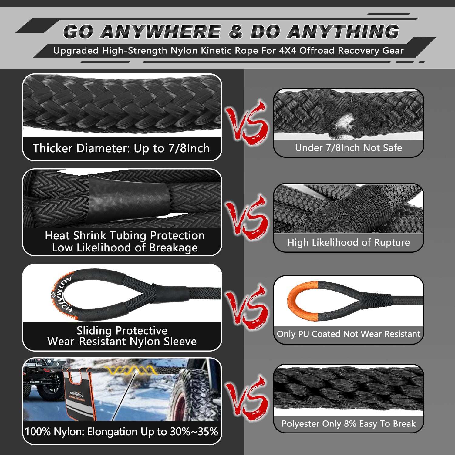 - Feature: The Kinetic Tow Rope Use 24-Strand Double-Layer Braided Nylon Structure For Extended Durability, Equipped with Upgraded Protective Sleeves and Auxiliary Shrink Tubes To Prevent Physical Wear and Tear While Easily Handling All Difficult Towing Points