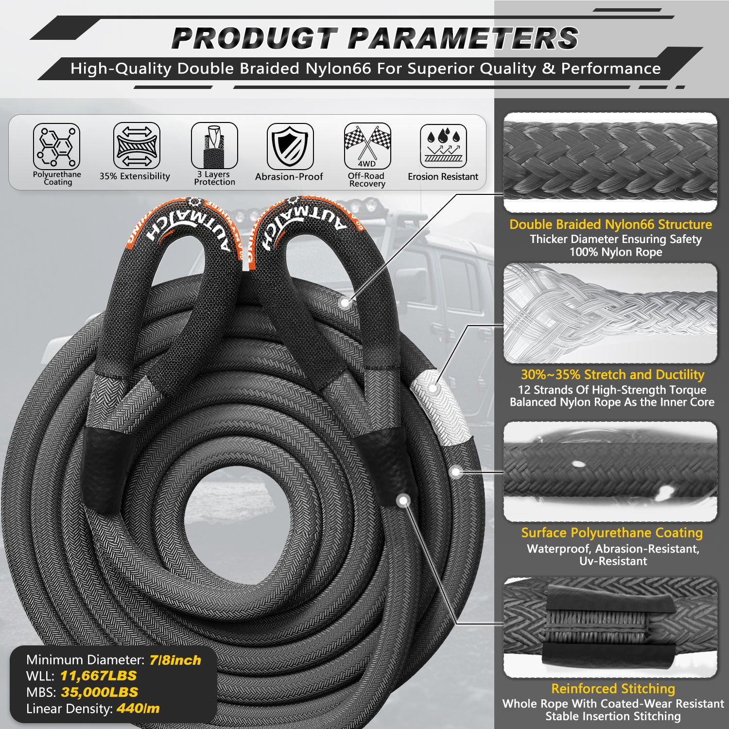 - Super Quality: The Kinetic Recovery Rope was Made of 100% Nylon N66 Double Braided Material and Coated with Mil-Spec Polymers, Which the Break Strength Up To 35000Lbs to Keep It More Safety & Stability, Capable of Recovering and Towing Off-road Vehicles, Pickups, ATV, Tractor, Truck Etc