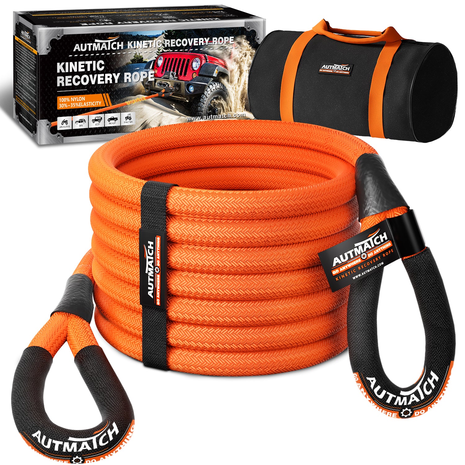 AUTMATCH Kinetic Recovery Tow Rope 7/8" x 30FT - Heavy Duty Energy Recovery Rope 35000Lbs, 35% Elasticity Offroad Snatch Strap for 4x4 Off-Road Vehicle, Truck, Trailer, ATV, UTV, Orange