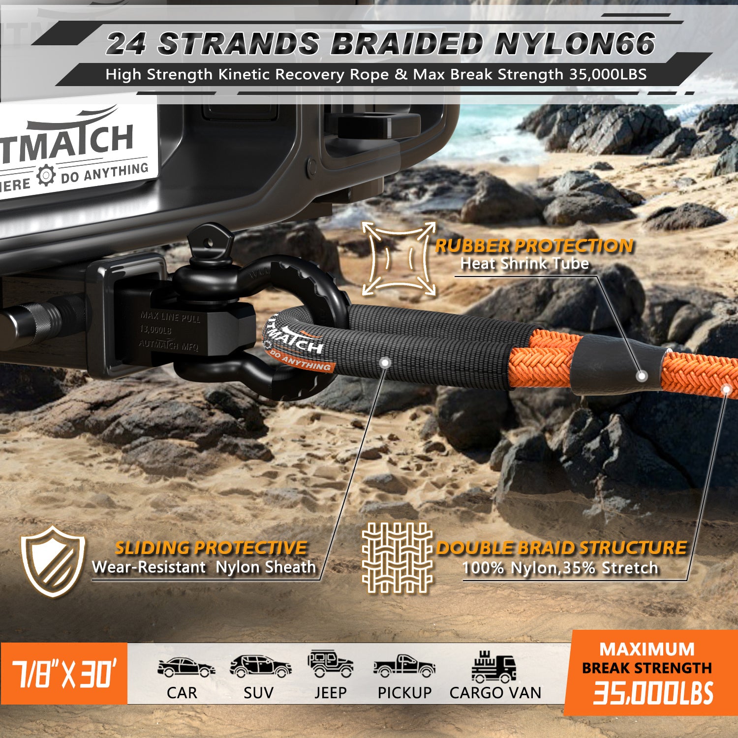 - Super Quality: The Kinetic Recovery Rope was Made of 100% Nylon N66 Double Braided Material and Coated with Mil-Spec Polymers, Which the Break Strength Up To 35000Lbs to Keep It More Safety & Stability, Capable of Recovering and Towing Off-road Vehicles, Pickups, ATV, Tractor, Truck Etc