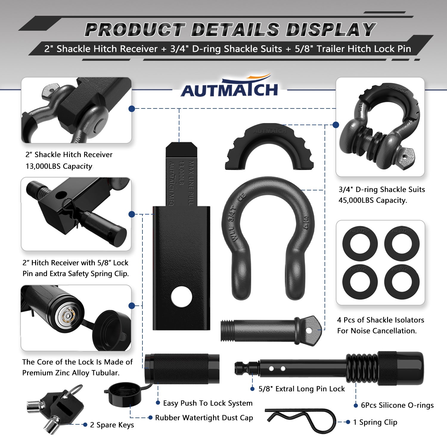 - Fitted Suite: 2" Shackle Hitch Receiver, Anti-Theft 5/8" Trailer Hitch Lock Pin, 3/4" D-ring Shackle with Shackle Isolator & 4Pcs Washers kits, Protect The Bumper From Scratches and Prevent Rattling and Stolen
