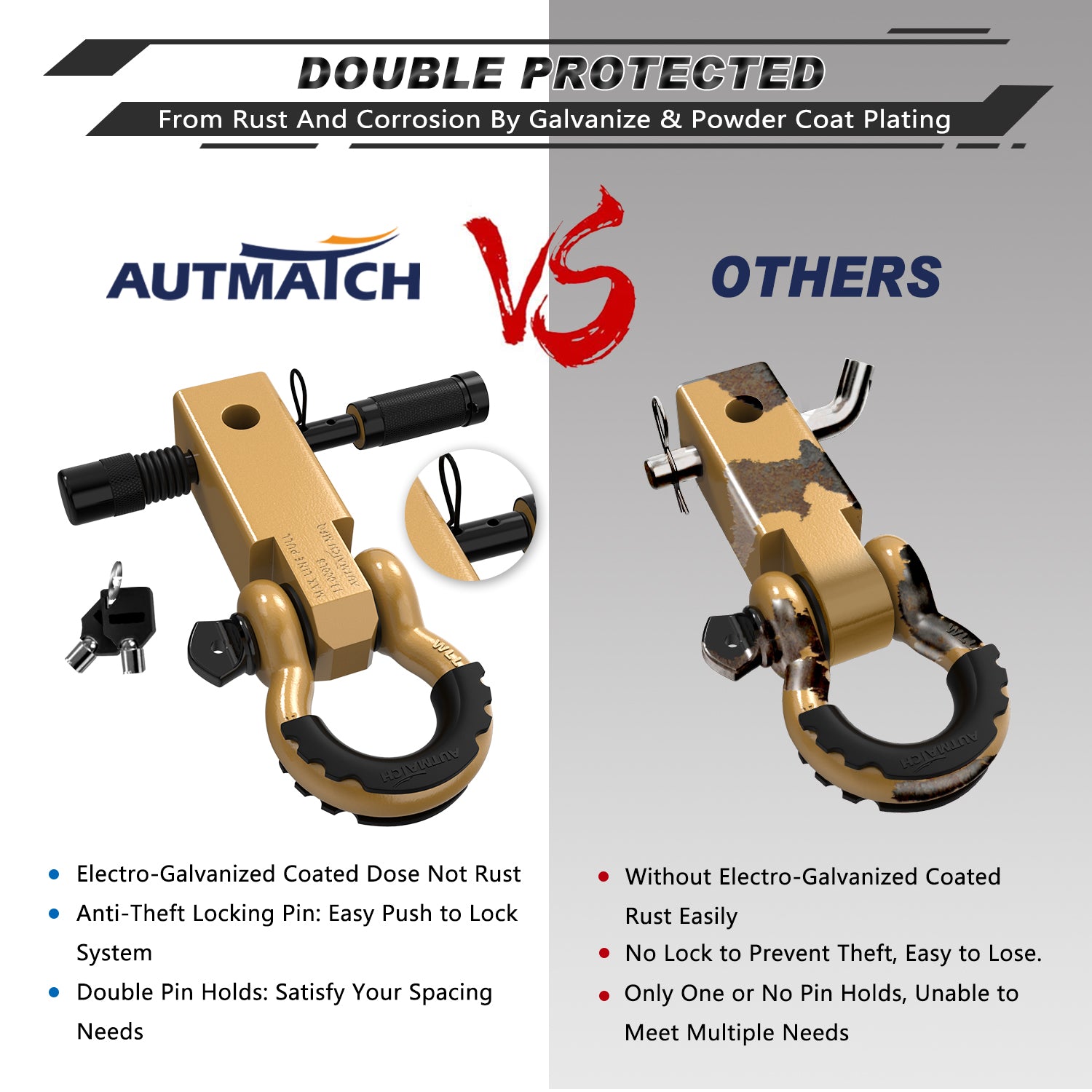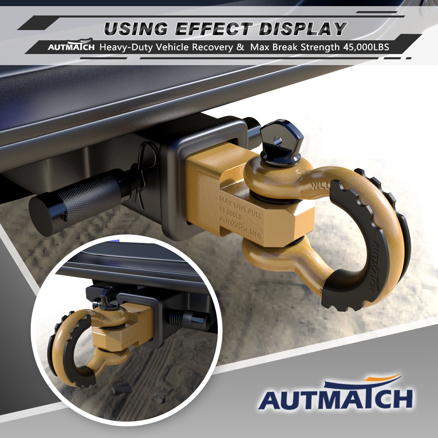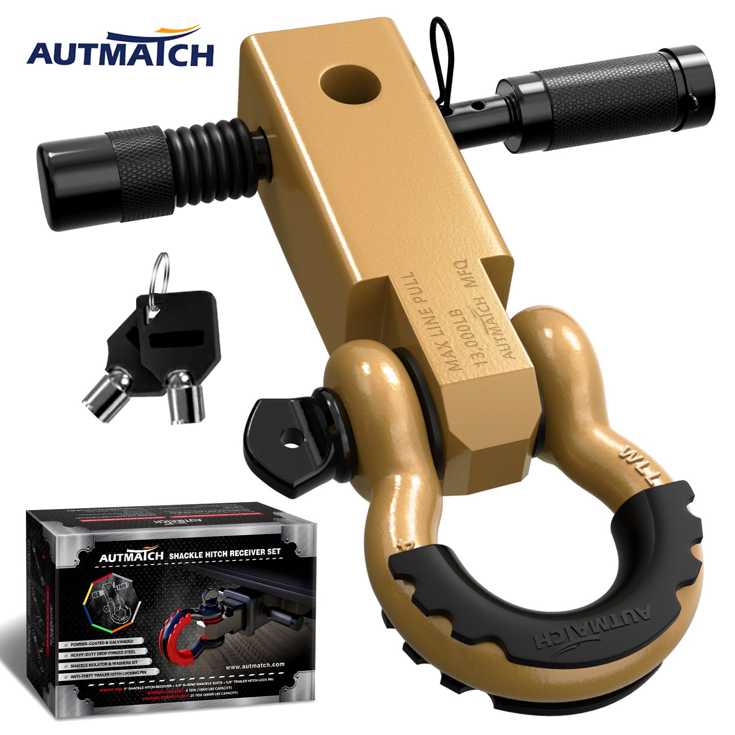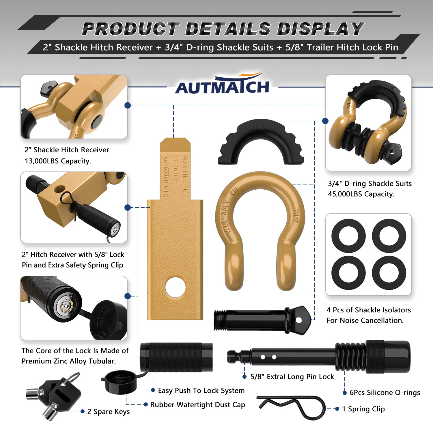 AUTMATCH Shackle Hitch Receiver 2 Inch with 3/4" D Ring Shackle and 5/8" Trailer Hitch Lock Pin, 45,000 Lbs Break Strength, Heavy Duty Receiver Kit for Vehicle Recovery, Gold