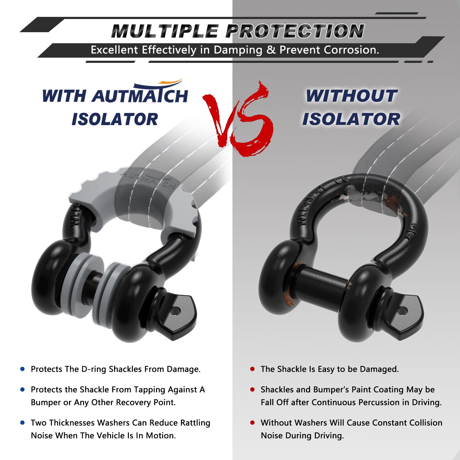 - Feature: The Isolator Protects the Shackle From Tapping Against A Bumper or Any Other Recovery Point and the Washers Reduce Rattling Noise When The Vehicle Is In Motion