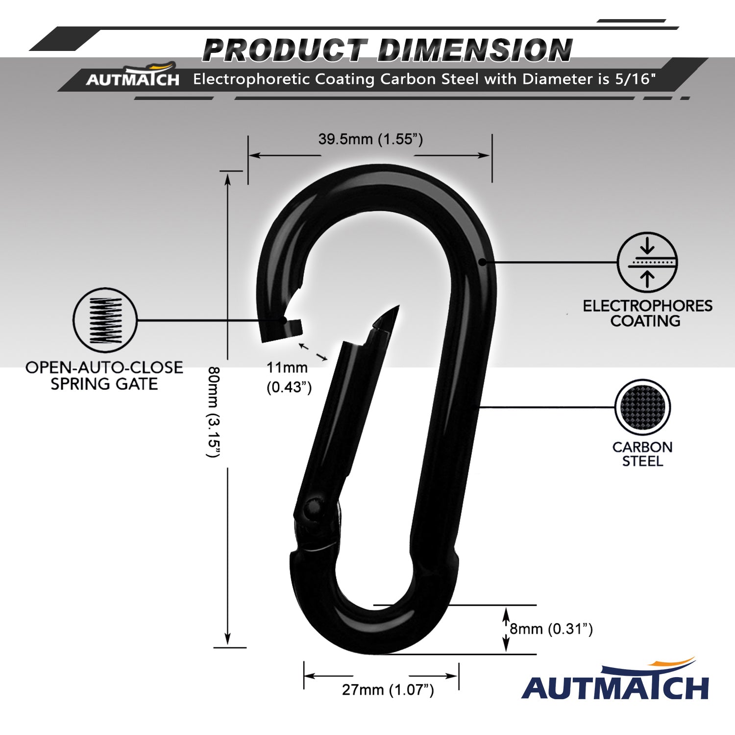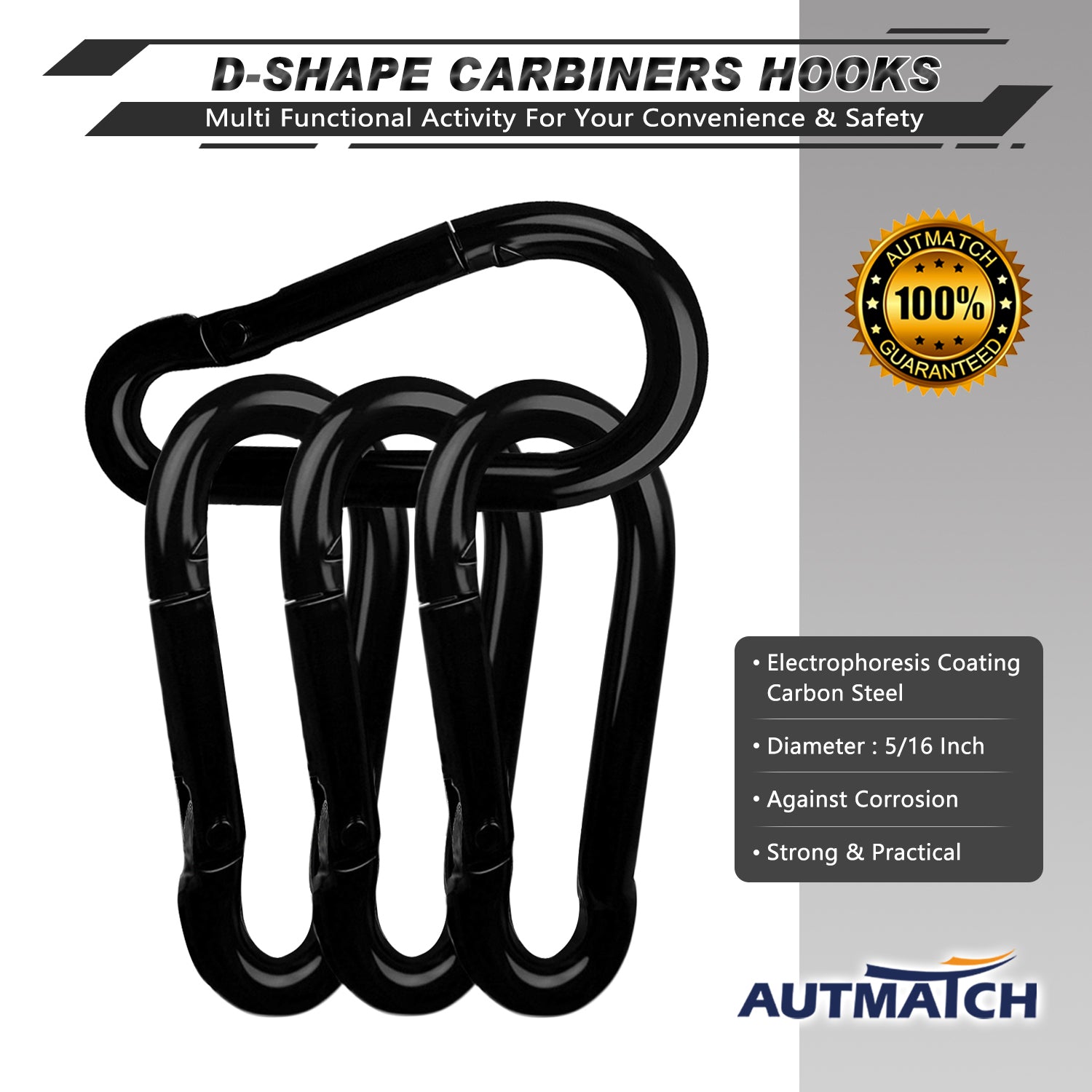 - Spec : Pack of 4 (3 Inch) - 5/16 Inch (8 X 80mm) D Shape Carabiners Clips / Spring Snap Hooks, Rigid Structure Design Ensures Open-Auto-Close Spring Gate Stability and Strength