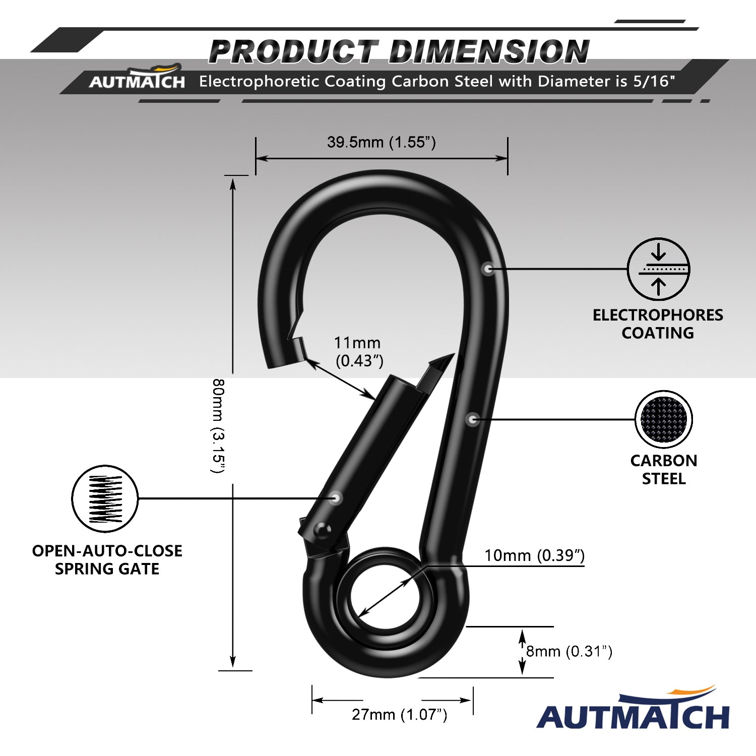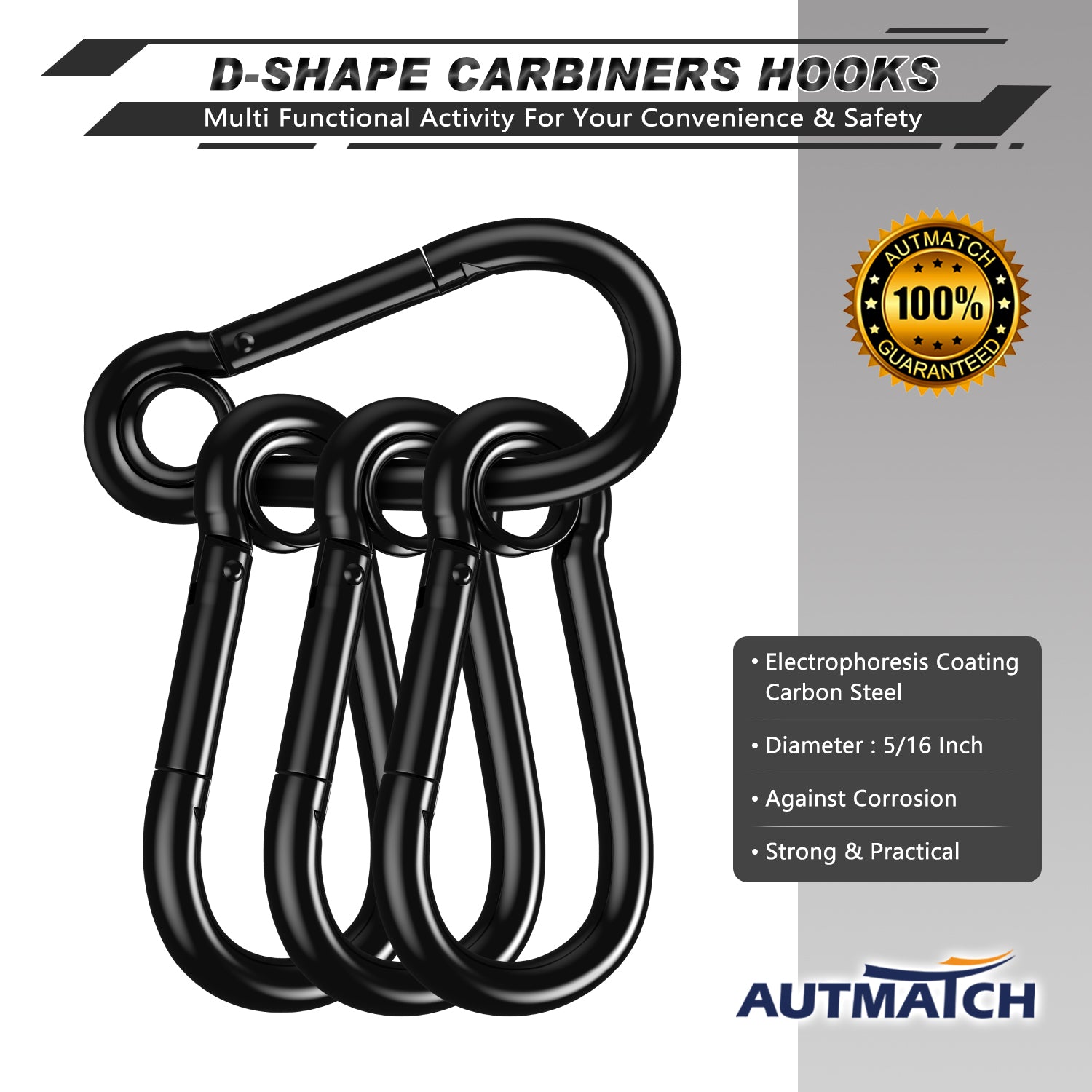 - Spec : Pack of 4 (3 Inch) - 5/16 Inch (8 X 80mm) D Shape Carabiners Clips / Spring Snap Hooks, Rigid Structure Design Ensures Open-Auto-Close Spring Gate Stability and Strength