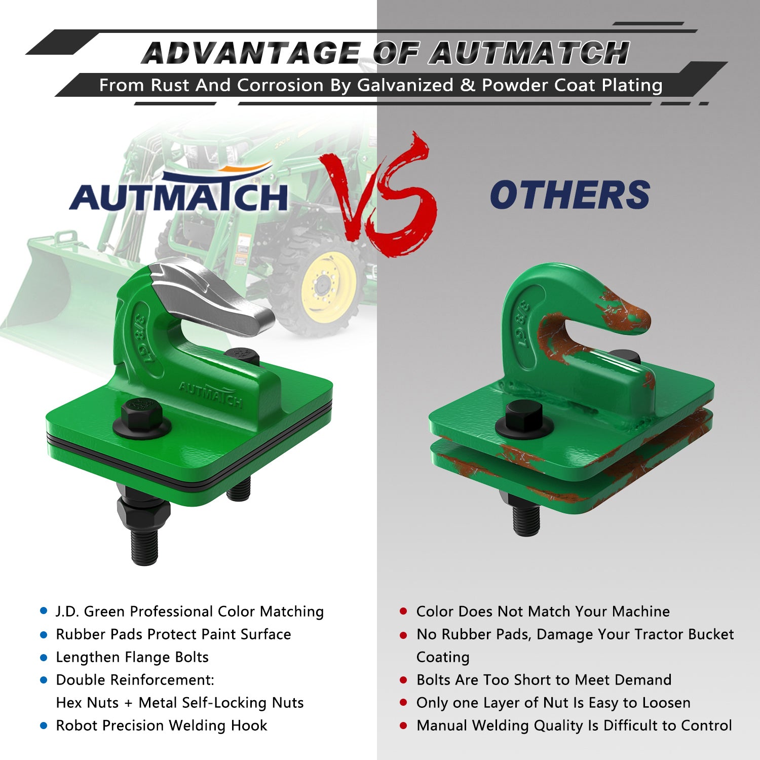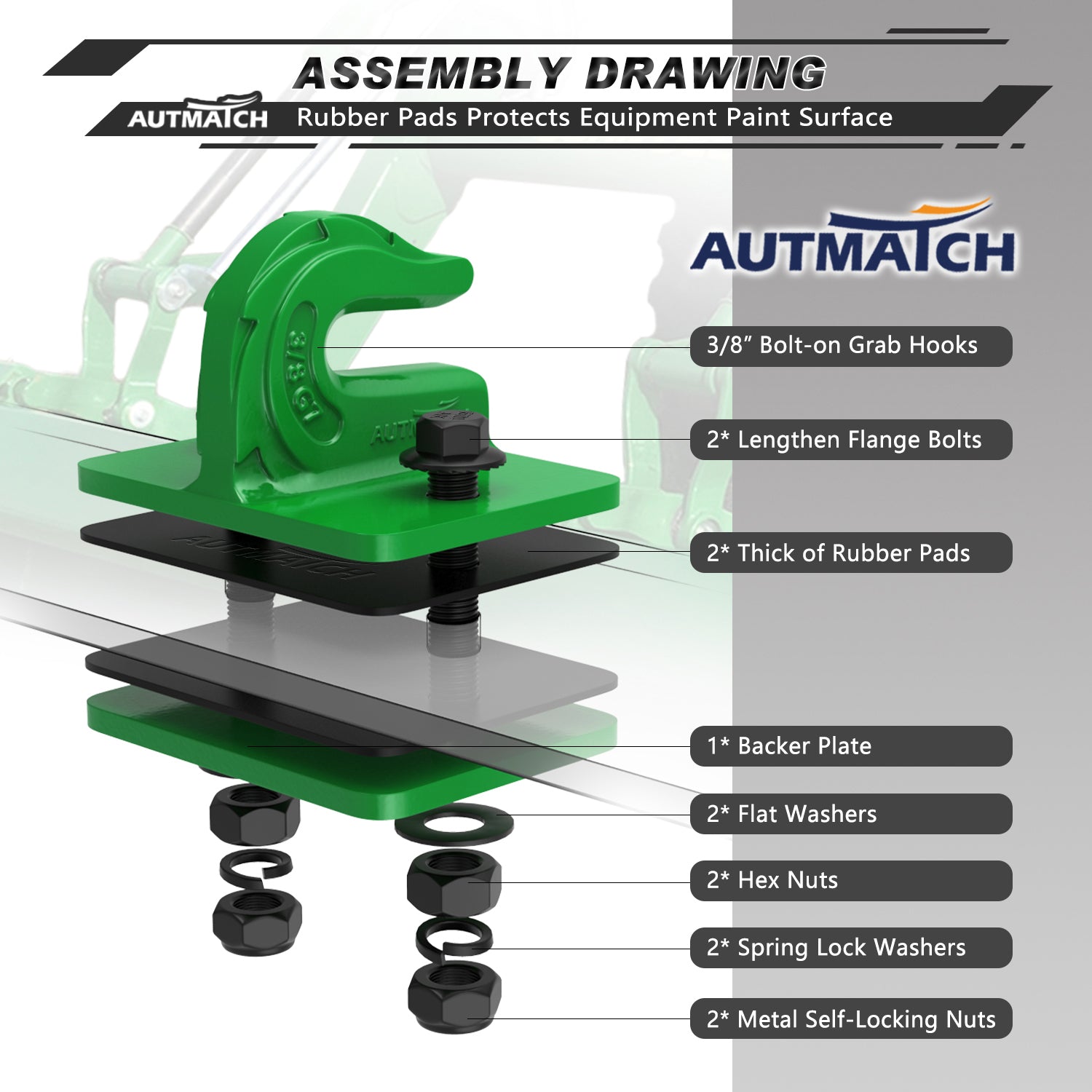 AUTMATCH Tractor Bucket Grab Hook 3/8" (2 Pack), Grade 70 Forged Steel Bolt On Grab Hook Tow Hook Mount with Backer Plate & Rubber Pads, Max 18,000Lbs Work for Loader, Tractor Bucket, Deere Green