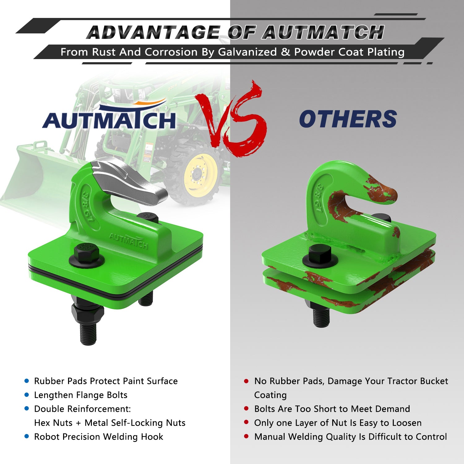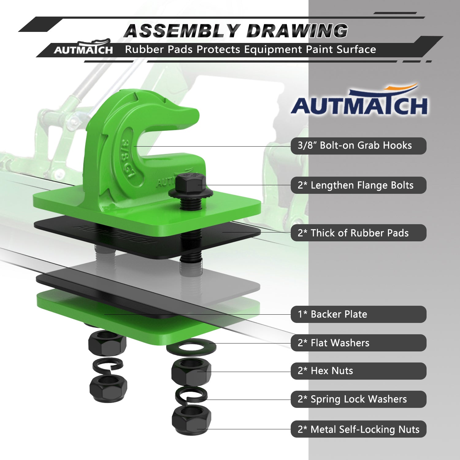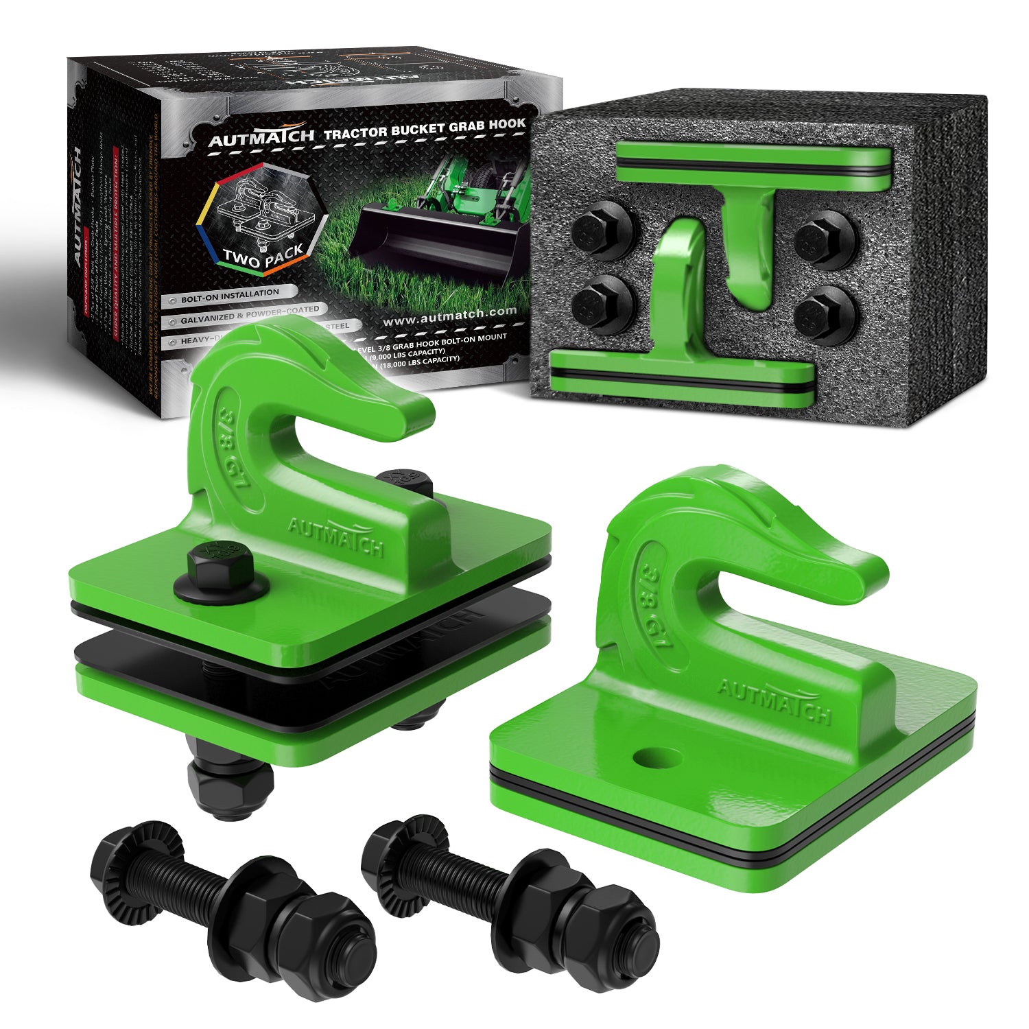 AUTMATCH Tractor Bucket Grab Hook 3/8" (2 Pack), Grade 70 Forged Steel Bolt On Grab Hook Tow Hook Mount with Backer Plate & Rubber Pads, Max 18,000Lbs Work for Loader, Tractor Bucket, Truck, Green