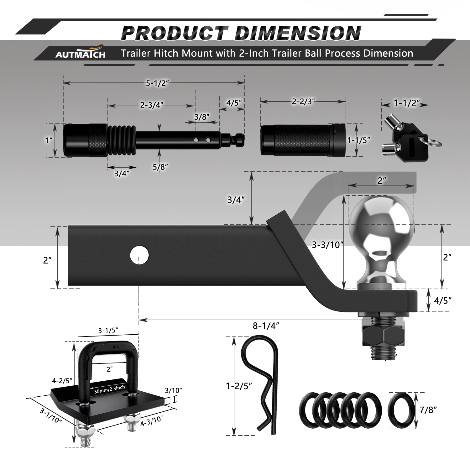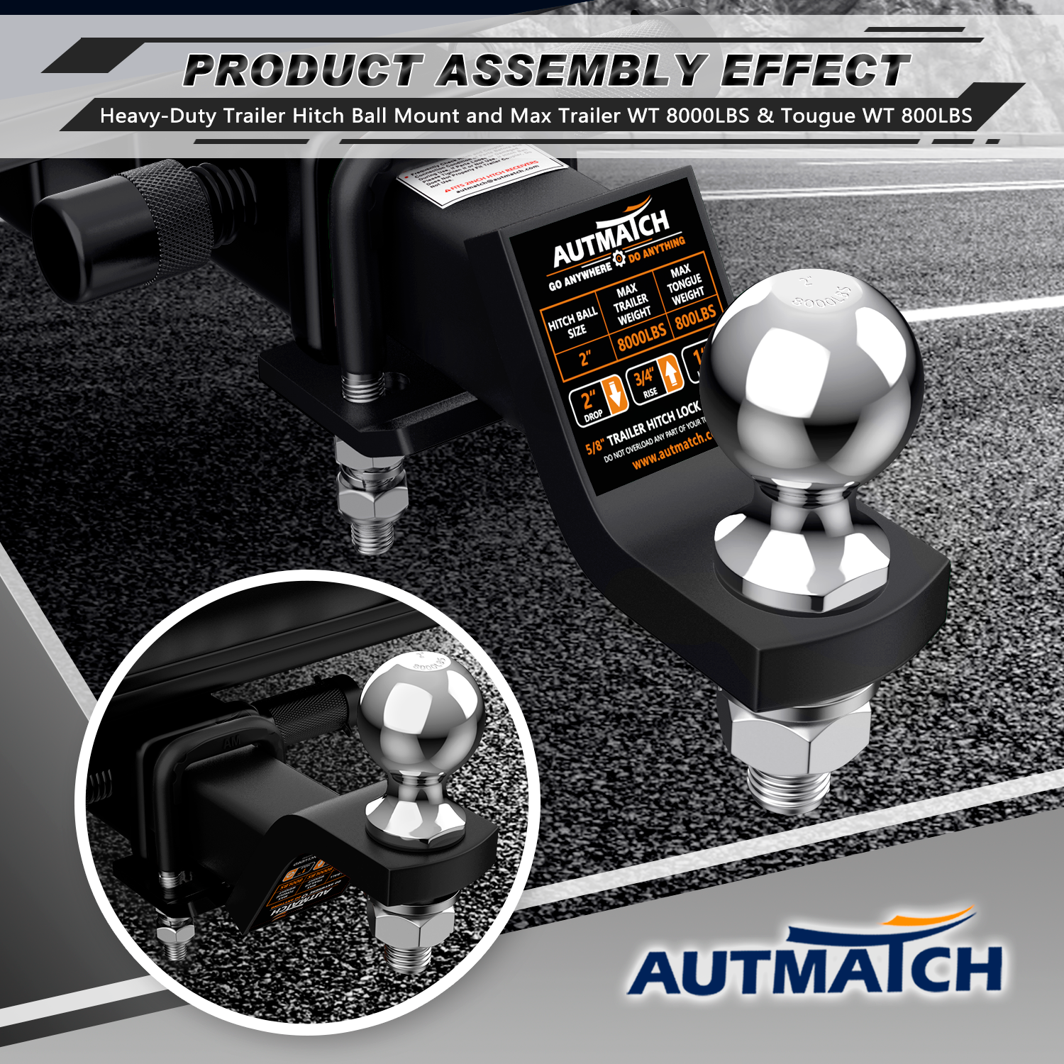 AUTMATCH Trailer Hitch Ball Mount with 2 Inch Hitch Ball - Fits 2" Receiver with Hitch Tightener, 8000Lbs Capacity Ball Hitch, 2-Inch Drop with 5/8" Hitch Lock Pin,Matte Black