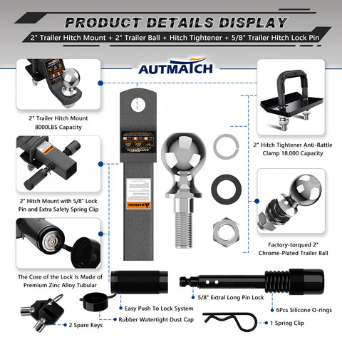 AUTMATCH Trailer Hitch Ball Mount with 2 Inch Hitch Ball - Fits 2" Receiver with Hitch Tightener, 8000Lbs Capacity Ball Hitch, 2-Inch Drop with 5/8" Hitch Lock Pin,Grainstone