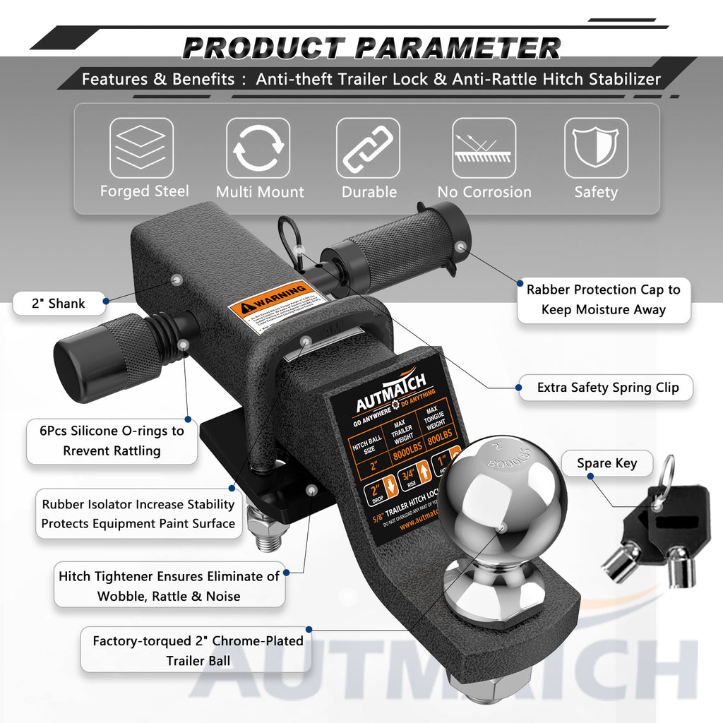 Fitted Suite: 5/8" Anti-Theft Trailer Hitch Lock Pin Protect Property Against Theft, The Push-To-Lock Key Design Easy To Operate + Hitch Tightener Anti-Rattle Clamp Ensures Eliminate Of Wobble, Rattle & Noise, Provide A Quiet And Stable Towing & Hauling Experience