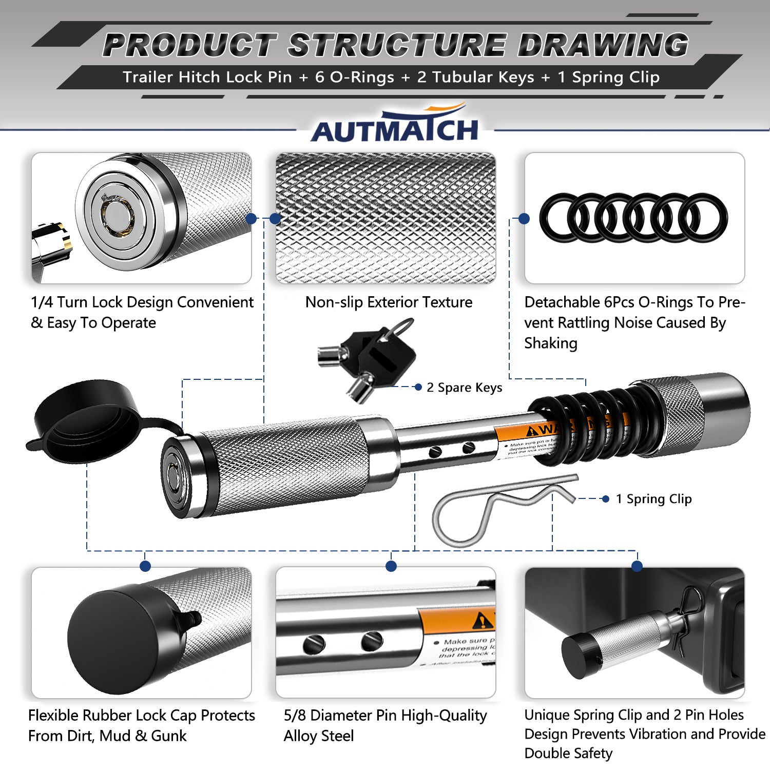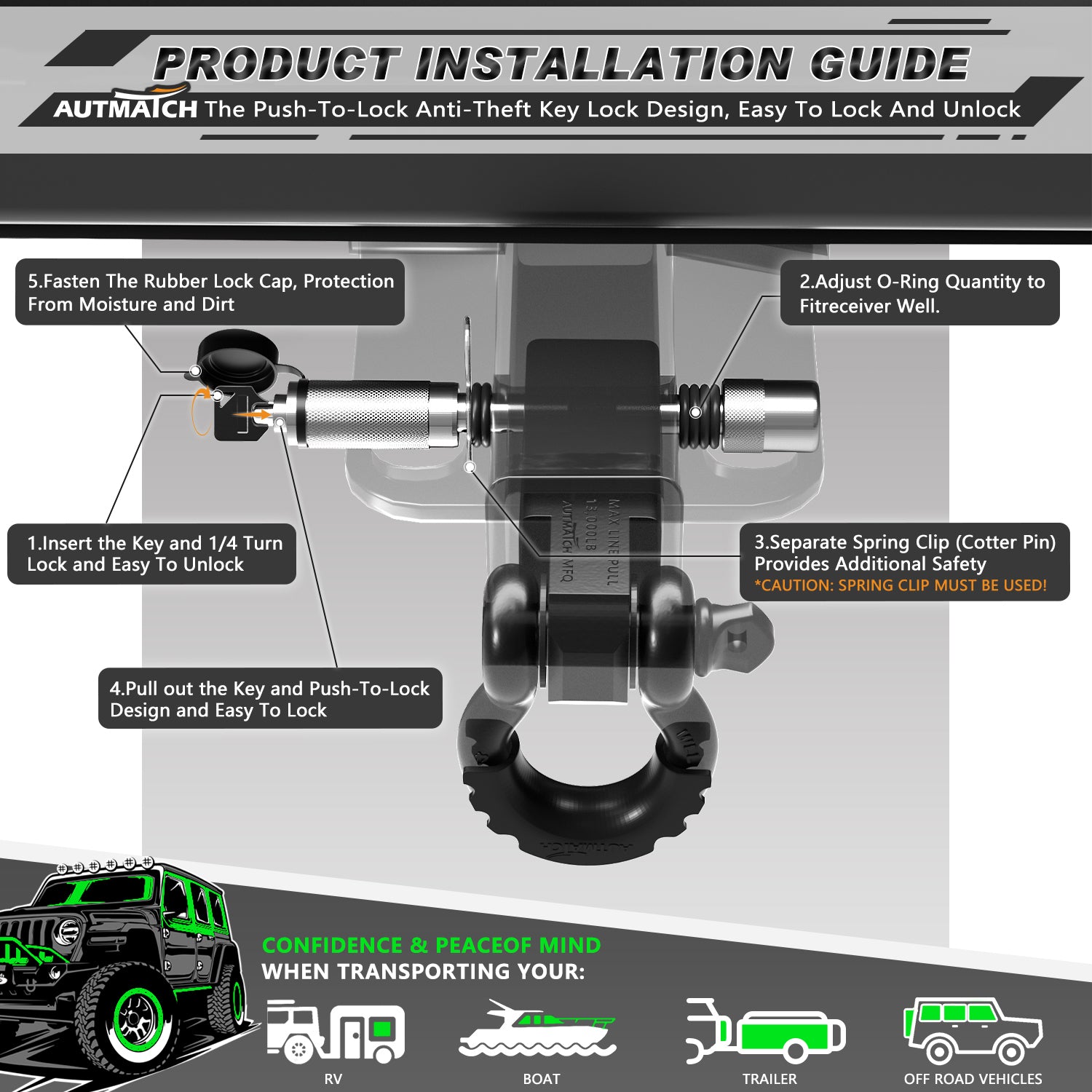 - Feature: The Push-To-Lock Anti-Theft Key Design and Match the Spring Clip and 2 Pin Holes Provide Double Safety. By Adjusting the Quantity and position of 6 Pcs O-Rings To Prevent Rattling Noise Caused By Shaking During Towing