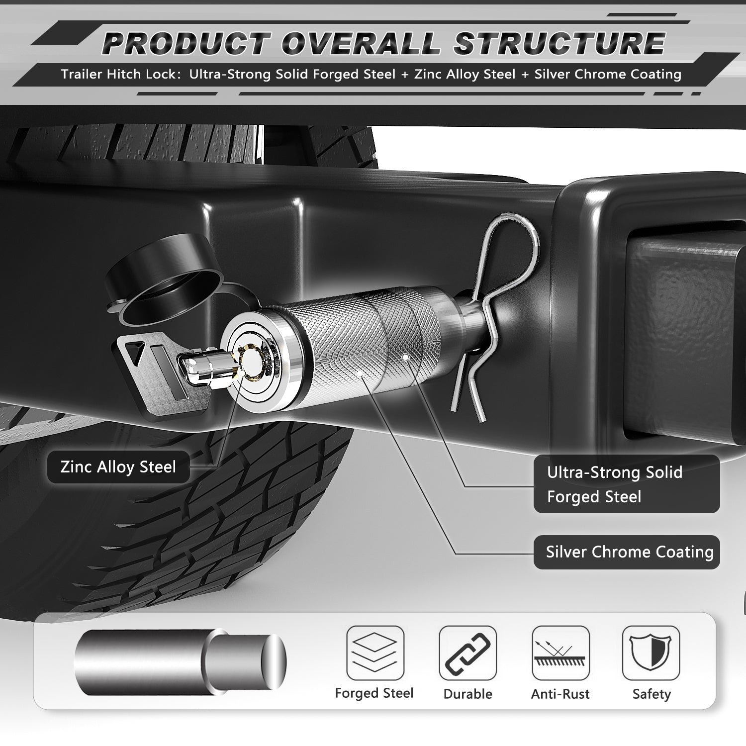 - Super Quality: Trailer Hitch Lock was Made of Ultra-Strong Solid Forged Steel with Silver Chrome Coating, The Keys and Lock Core was Made of Zinc Alloy Steel with Up to 22,000 LBS Load Rating, Keep It More Safety & Reliable