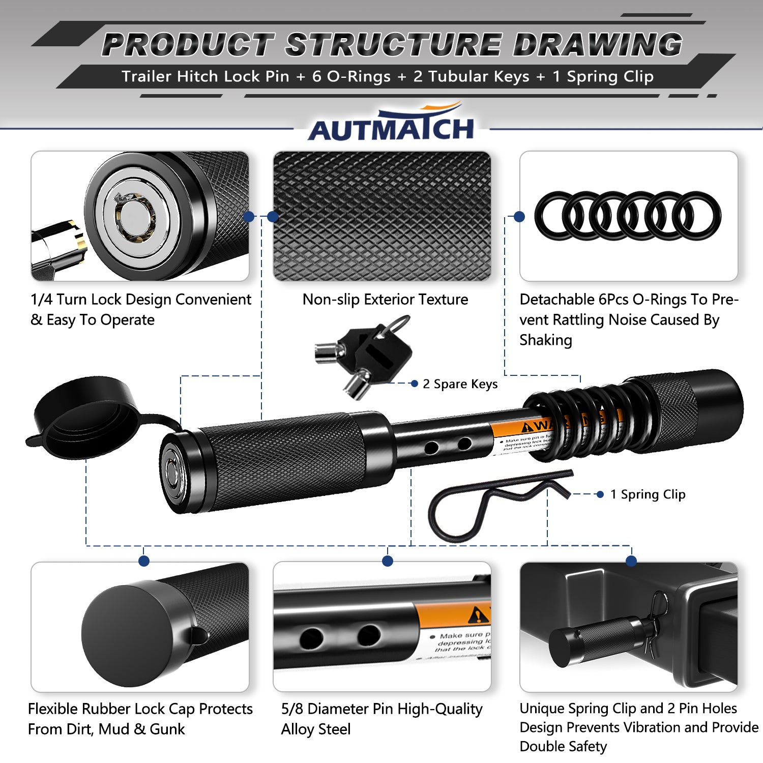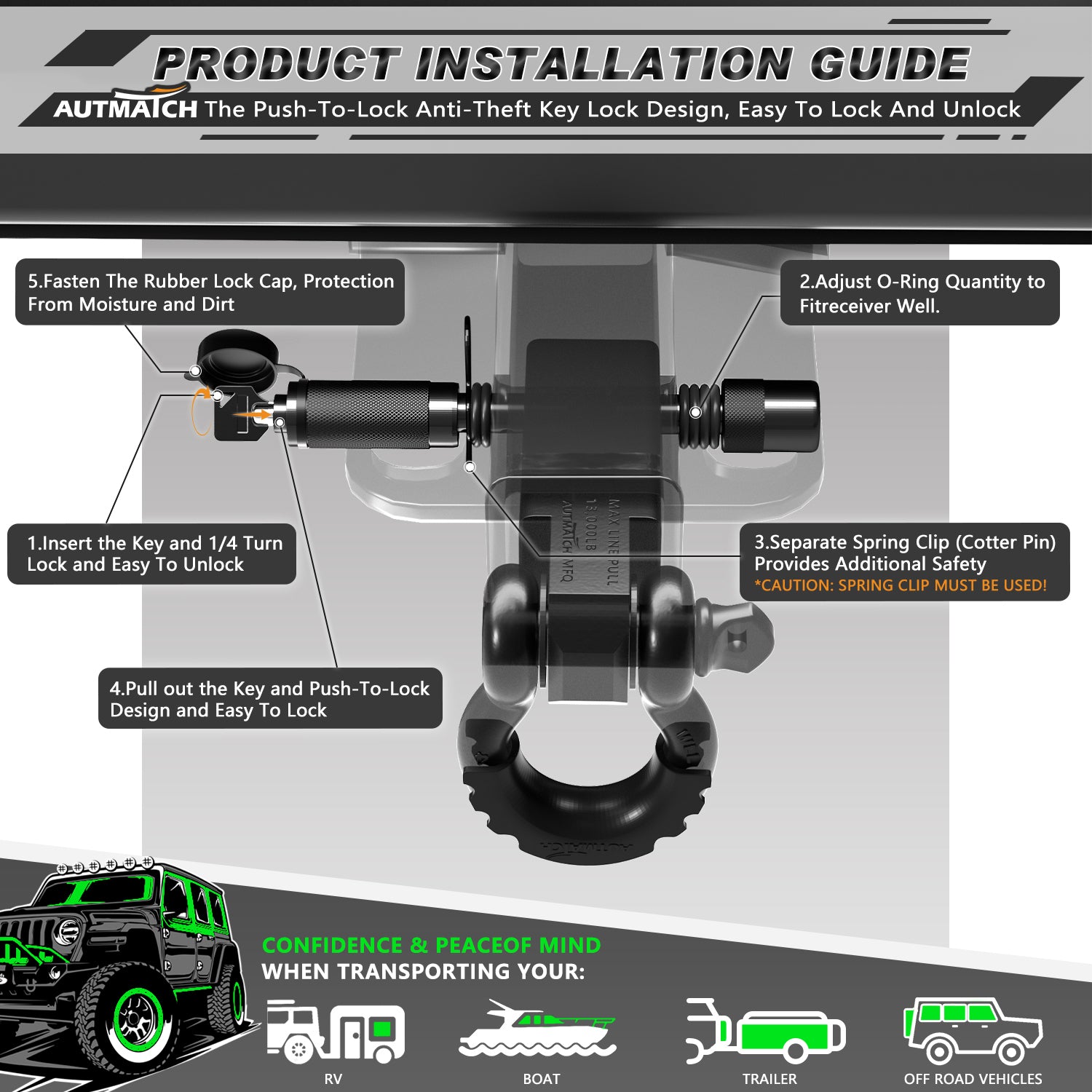 - Feature: The Push-To-Lock Anti-Theft Key Design and Match the Spring Clip and 2 Pin Holes Provide Double Safety. By Adjusting the Quantity and position of 6 Pcs O-Rings To Prevent Rattling Noise Caused By Shaking During Towing.