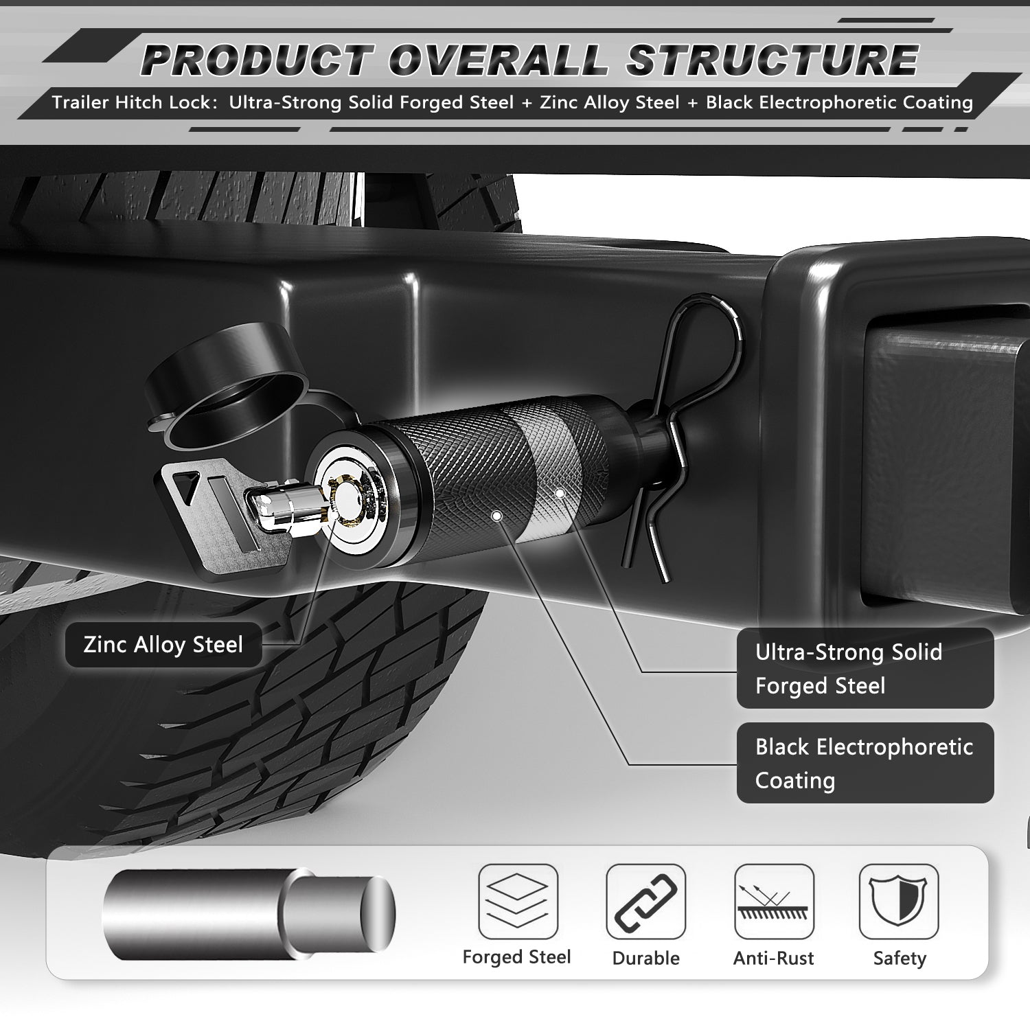 - Super Quality: Trailer Hitch Lock was Made of Ultra-Strong Solid Forged Steel with Black Electrophoretic Coating, The Keys and Lock Core was Made of Zinc Alloy Steel with Up to 22,000 LBS Load Rating, Keep It More Safety & Reliable