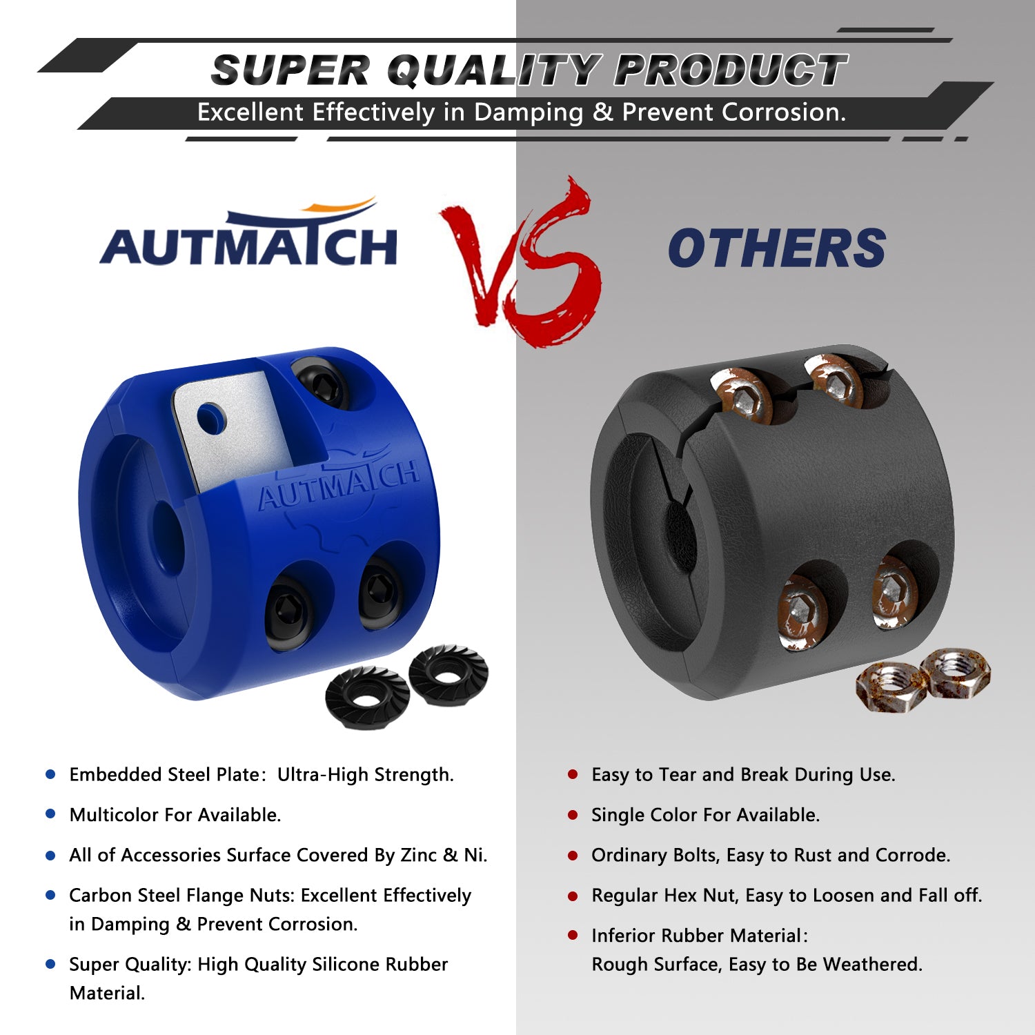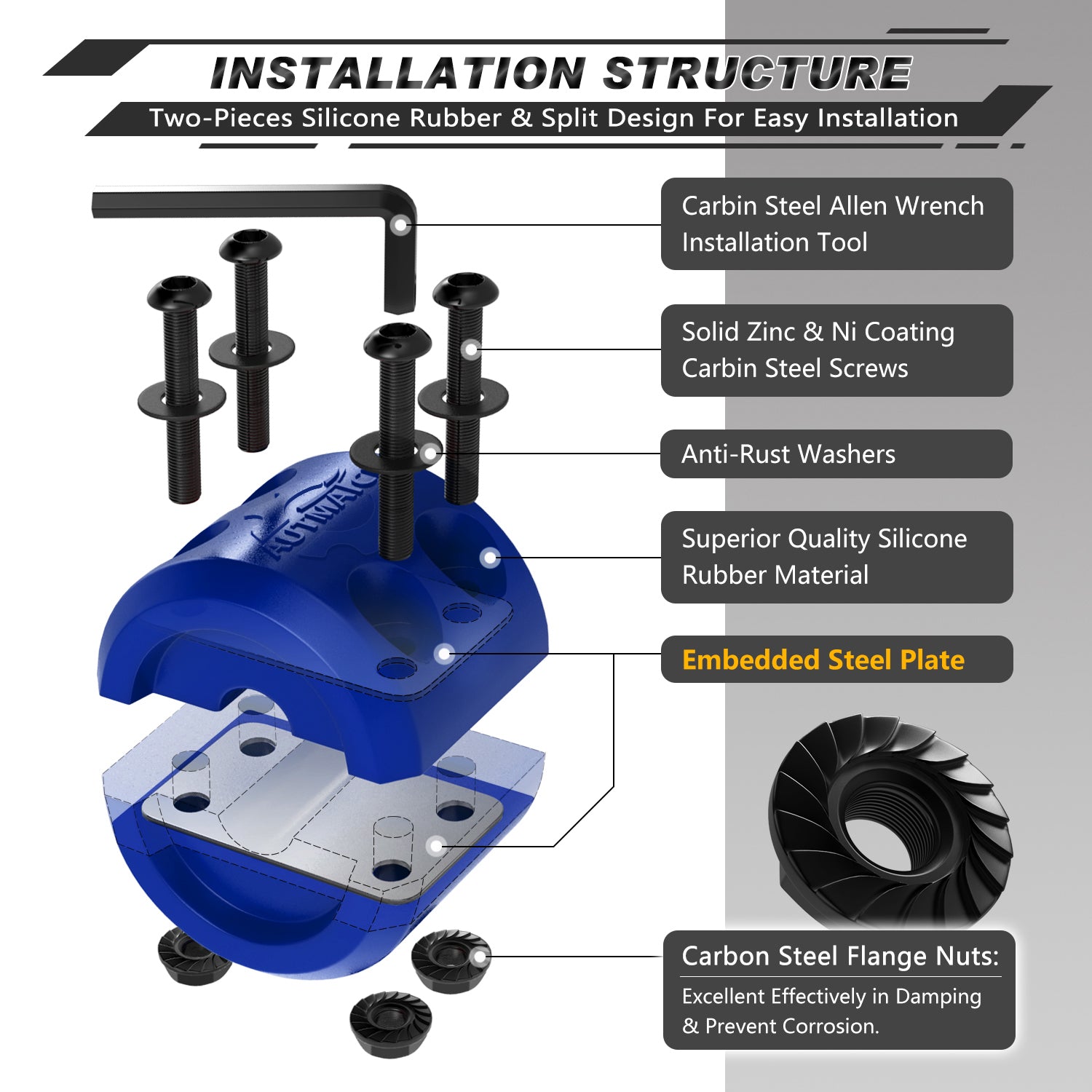 - Fitted Suite: Two-Pieces Silicone Rubber Design with Four Solid Carbon Steel Bolts, Four Locking Nuts and Four Washers Add a Portable Allen Wrench Tool, Split Design for Easy Installation. All of These Accessories Surface Covered By Zinc & Ni