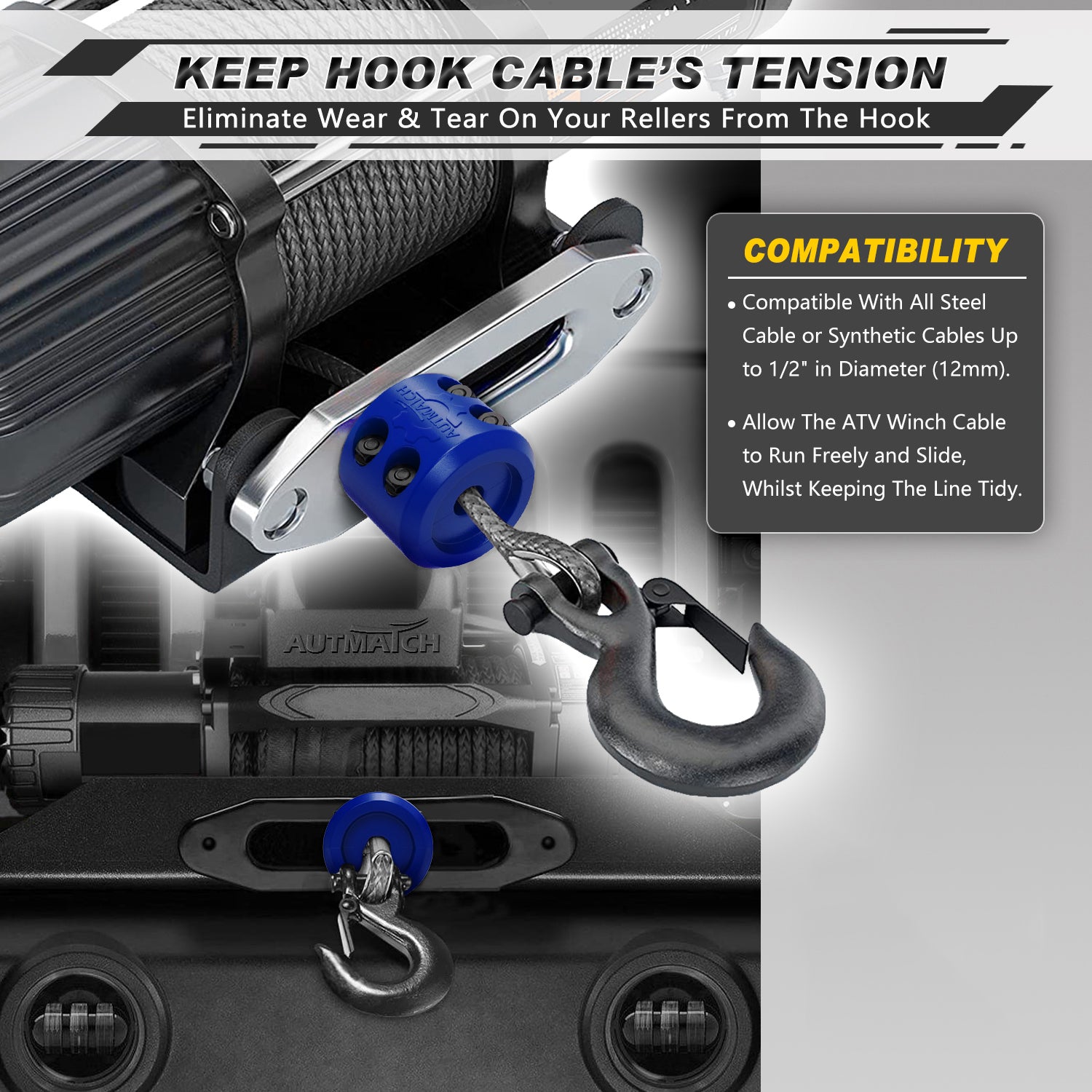 - Compatibility: Compatible With All Steel Cable or Synthetic Cables Up to 1/2" in Diameter (12mm). Allow The ATV Winch Cable to Run Freely and Slide, Whilst Keeping The Line Tidy. Protect Your Winching Gear Like Never Before. For Trucks, ATV, UTV, ORV, Trailers, and Sport-Utility Vehicles Etc