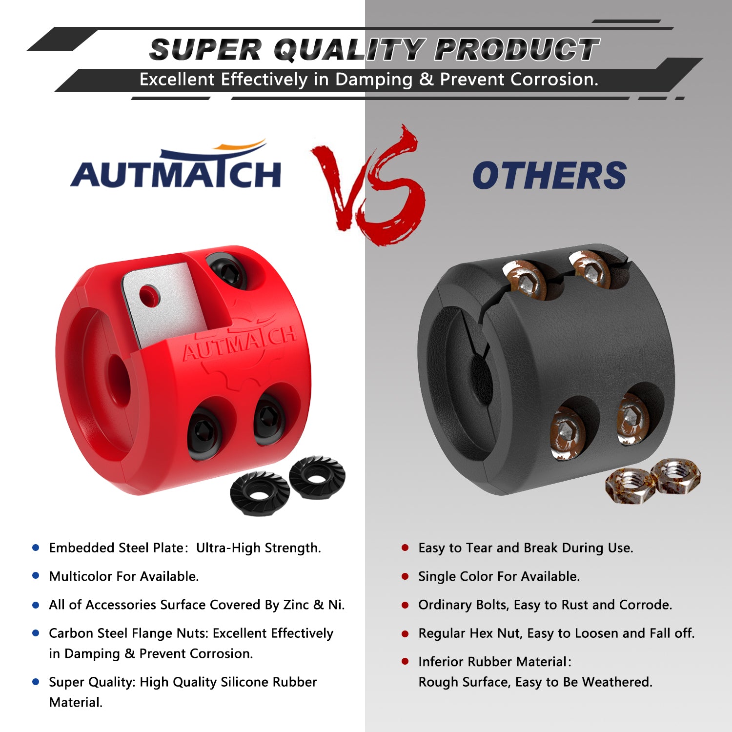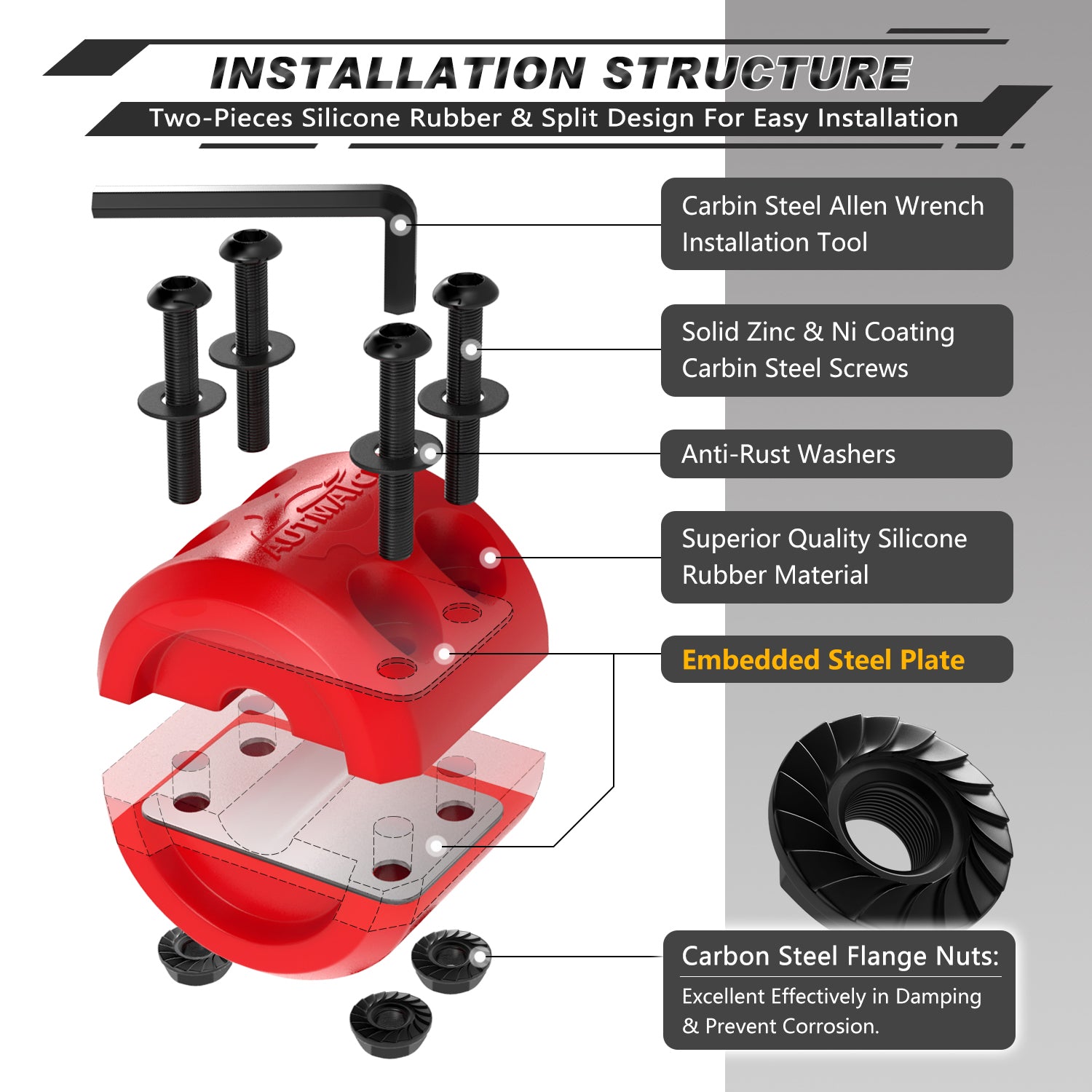 • Fitted Suite: Two-Pieces Silicone Rubber Design with Four Solid Carbon Steel Bolts, Four Locking Nuts and Four Washers Add a Portable Allen Wrench Tool, Split Design for Easy Installation. All of These Accessories Surface Covered By Zinc & Ni