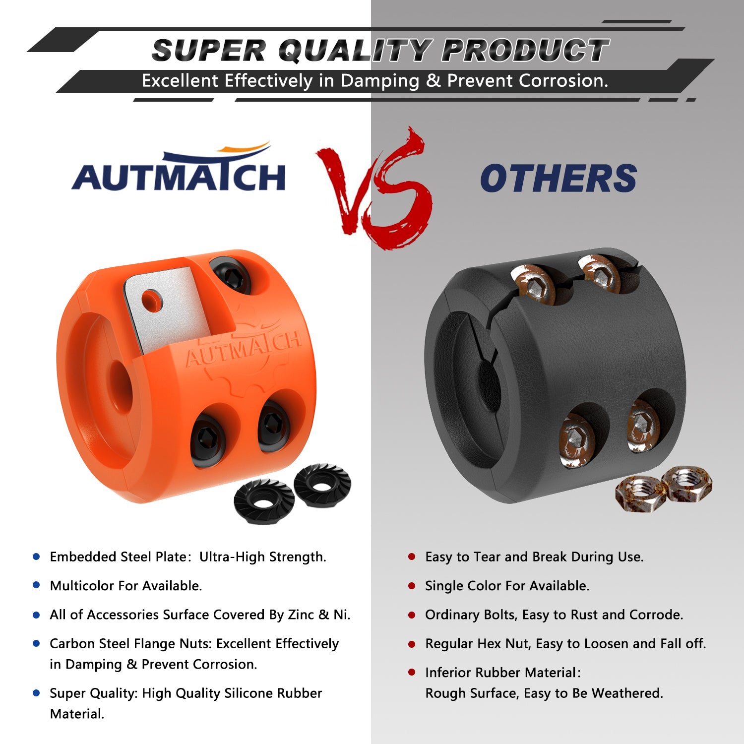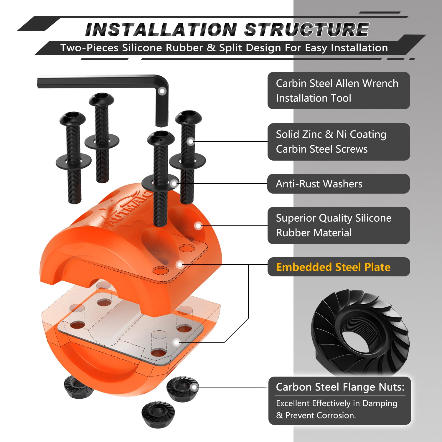 • Fitted Suite: Two-Pieces Silicone Rubber Design with Four Solid Carbon Steel Bolts, Four Locking Nuts and Four Washers Add a Portable Allen Wrench Tool, Split Design for Easy Installation. All of These Accessories Surface Covered By Zinc & Ni