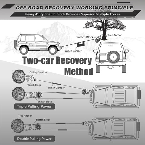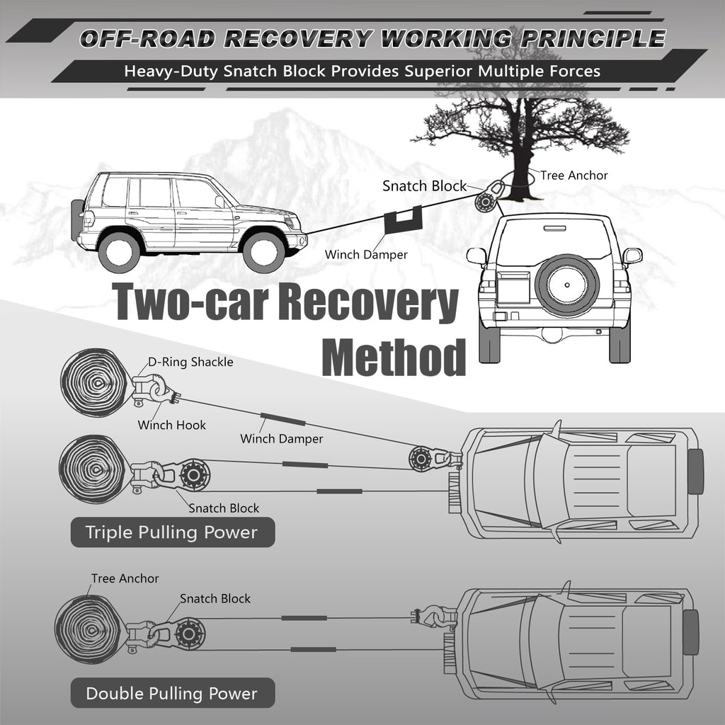 Universal Fit: The Forged Snatch Block Works with 7/32" - 5/8” (15mm)Steel Cable or Synthetic Winch Rope, By Setting Up A Movable Pulley Block System, Increase The Winch Pulling Force, Improve The Performance of The Winch, and Change The Direction of Recovery In Complex Situations Where There Is No Straight Fixed Point
