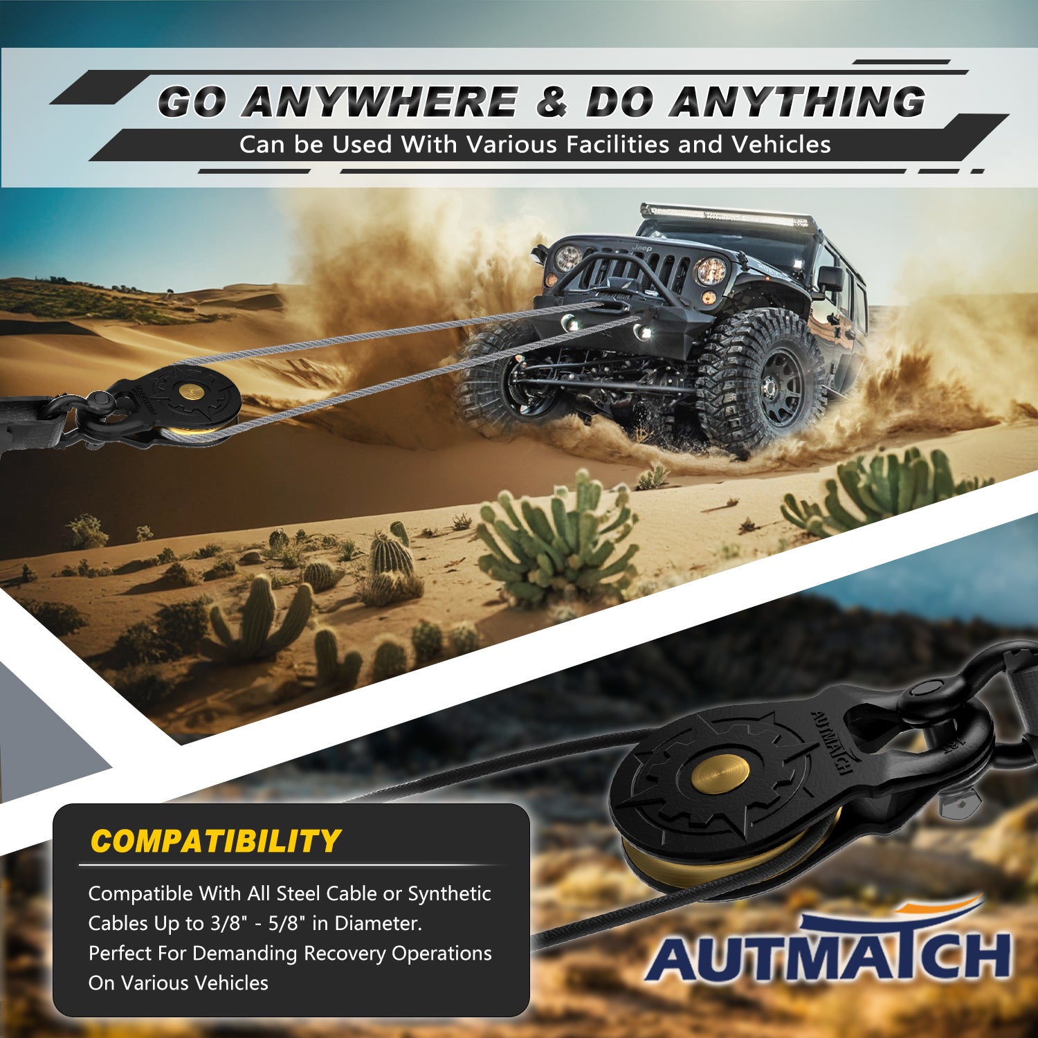 - Universal Fit: The Forged Snatch Block Works with 7/32" - 5/8” (15mm)Steel Cable or Synthetic Winch Rope, By Setting Up A Movable Pulley Block System, Increase The Winch Pulling Force, Improve The Performance of The Winch, and Change The Direction of Recovery In Complex Situations Where There Is No Straight Fixed Point