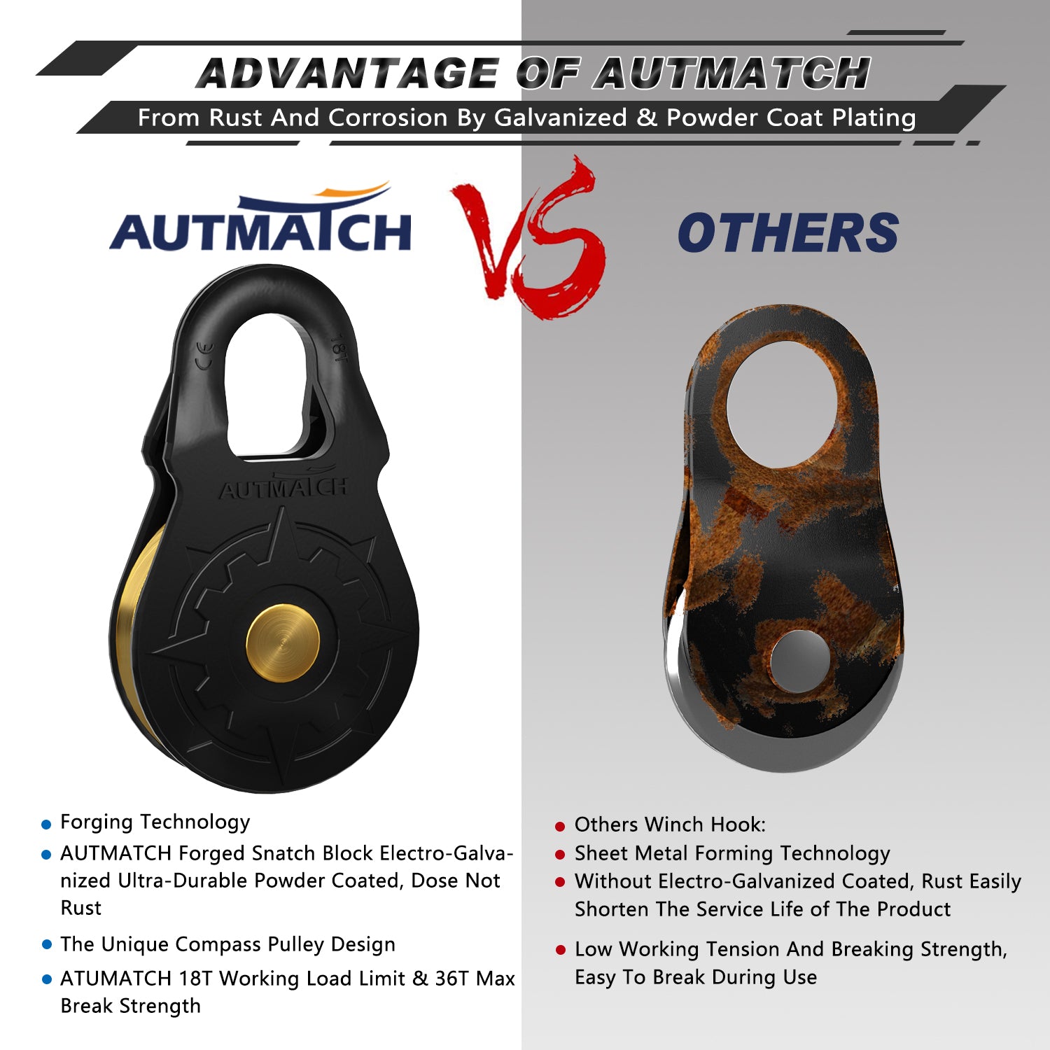 AUTMATCH Winch Snatch Block 18 Ton - Winch Pulley (79,366 Lbs) Break Strength, Heavy Duty Off Road Recovery Towing Pulley Blocks for Synthetic Rope or Steel Cable, Truck, UTV, ATV, Matte Black