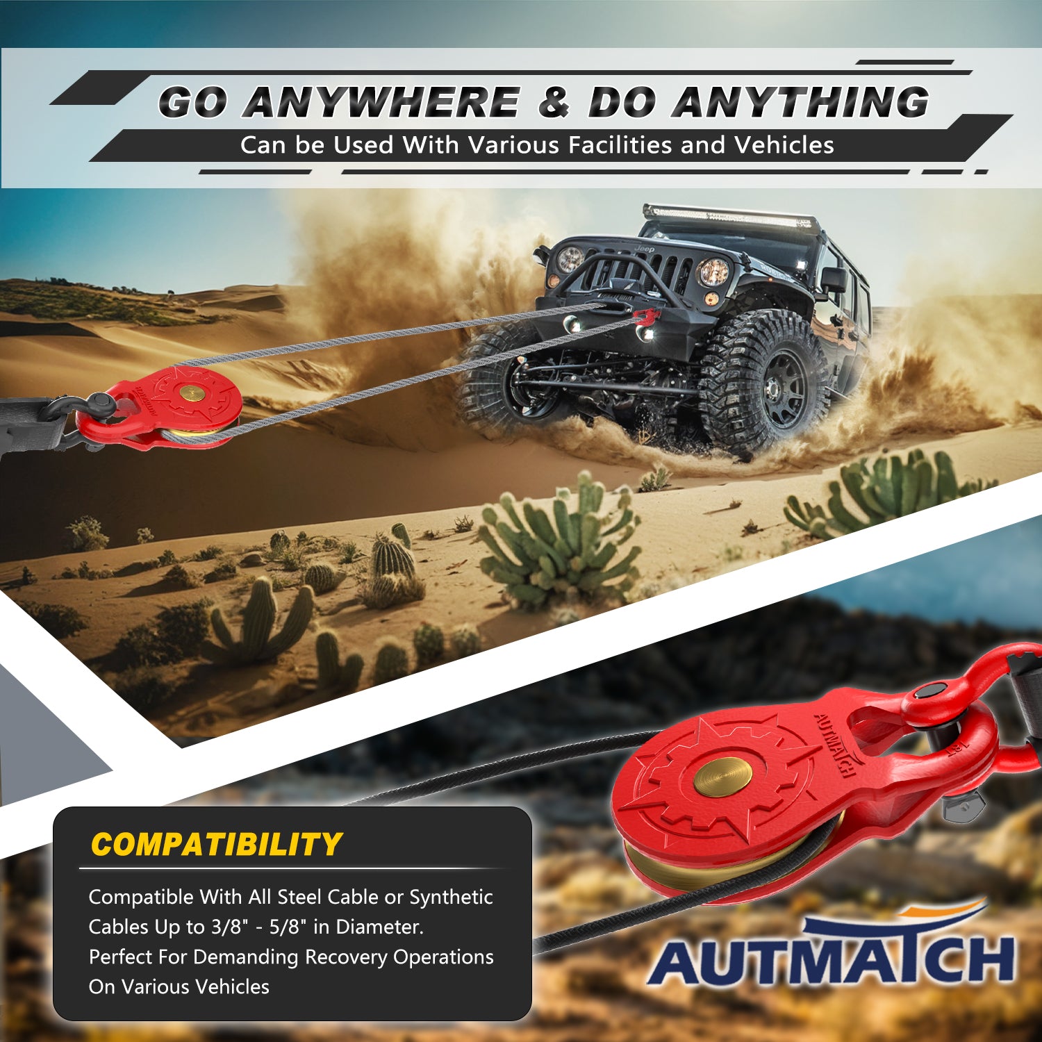 - Universal Fit: The Forged Snatch Block Works with 7/32" - 5/8” (15mm)Steel Cable or Synthetic Winch Rope, By Setting Up A Movable Pulley Block System, Increase The Winch Pulling Force, Improve The Performance of The Winch, and Change The Direction of Recovery In Complex Situations Where There Is No Straight Fixed Point