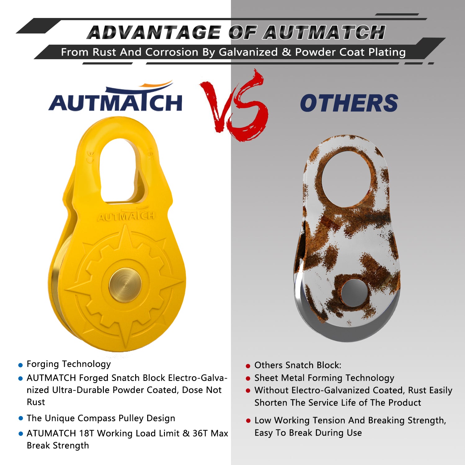 - Super Quality: Winch Snatch Block Pulley was Made of Ultra-Strong Drop Forged Steel with Heat Treated and Pulley Ring & Axle Made of Alloy Steel and Brass, It was Towing Capacity Up To 18T (39,683Lbs) and Max 36T (79,366Lbs) Break Strength, To Keep It More Safety & Stability, Off-Road Recovery Essential