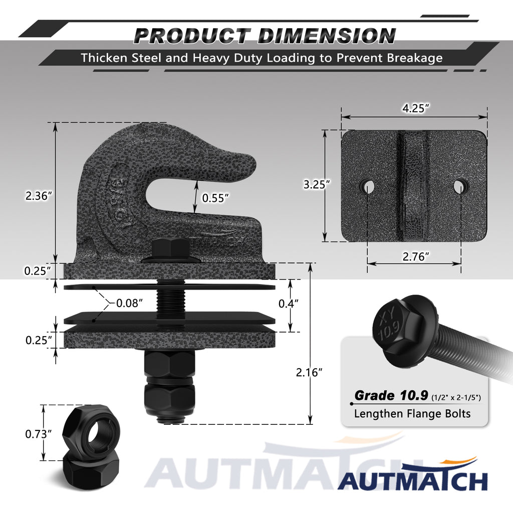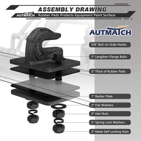 Fitted Suite: Grade 70 Level 3/8” Tractor Grab Hook Bolt-on Mount with Backer Plate and Rubber Pads, 4Pcs of Grade 10.9 Lengthen Flange Bolts + Flat Washers + Hex Nuts + Spring Lock Washers + Metal Self-Locking Nuts, All the Hardware of Surface was Covered By Electro-Plating Black Protect