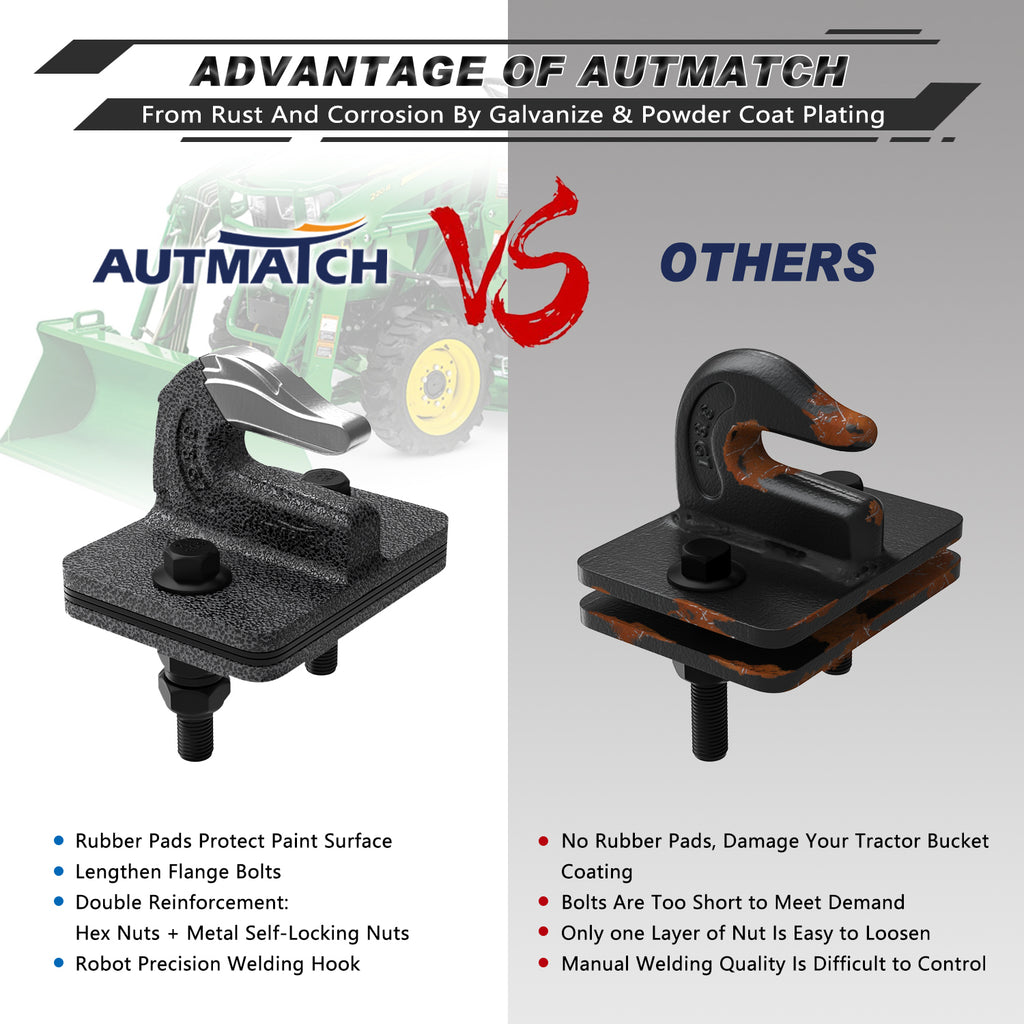 Multiple Protection: Tractor Bucket Grab Hook for Prevent Rust and Corrosion By Galvanized & Powder Coated and the Rubber Pads Protects Equipment Paint Surface, Withstands Harsh Weather Conditions and Extended Service Life