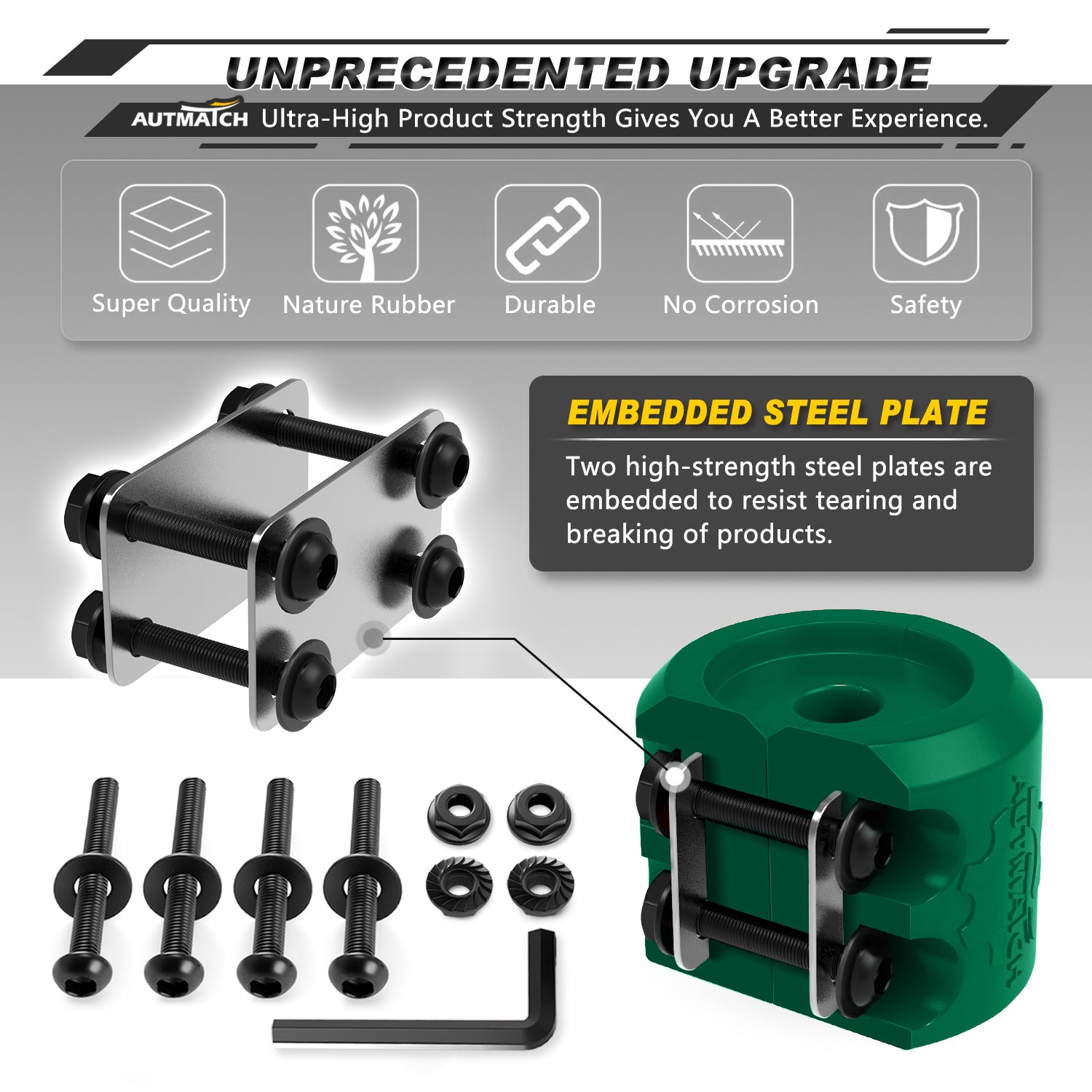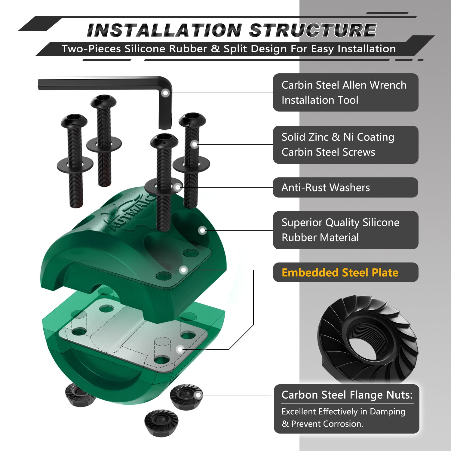 - Fitted Suite: Two-Pieces Silicone Rubber Design with Four Solid Carbon Steel Bolts, Four Locking Nuts and Four Washers Add a Portable Allen Wrench Tool, Split Design for Easy Installation. All of These Accessories Surface Covered By Zinc & Ni
