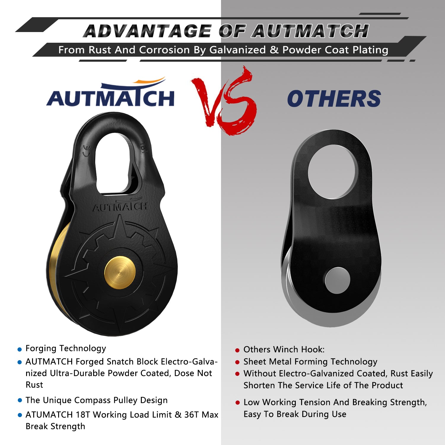 - Super Quality: Winch Snatch Block Pulley was Made of Ultra-Strong Drop Forged Steel with Heat Treated and Pulley Ring & Axle Made of Alloy Steel and Brass, It was Towing Capacity Up To 18T (39,683Lbs) and Max 36T (79,366Lbs) Break Strength, To Keep It More Safety & Stability, Off-Road Recovery Essential